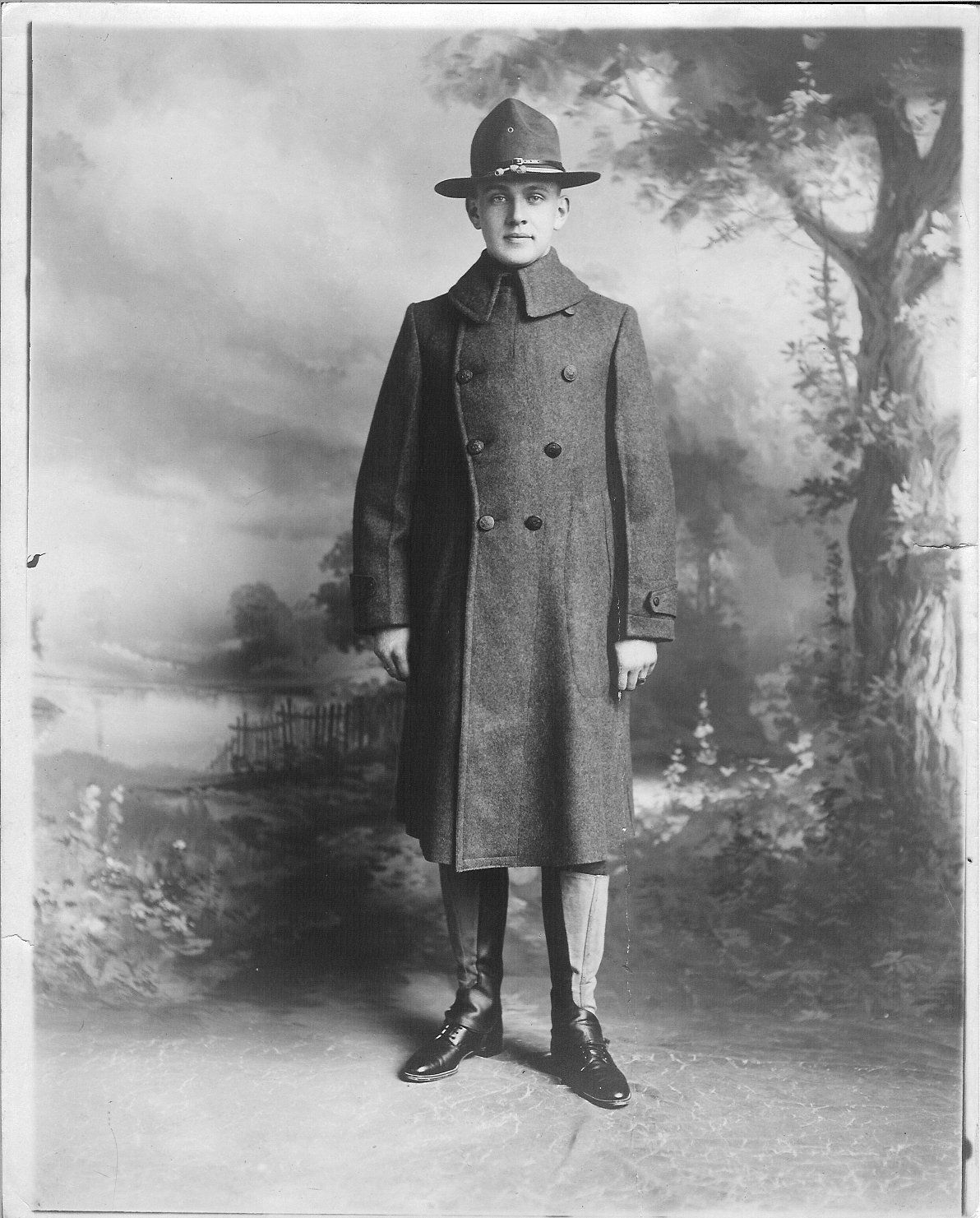 Black and white of young man in WW I army uniform; visible is hat, overcoat, puttees and black shoes; studio print as backdrop consists of a tree on the right body of water surrounded by a picket fence on the left.