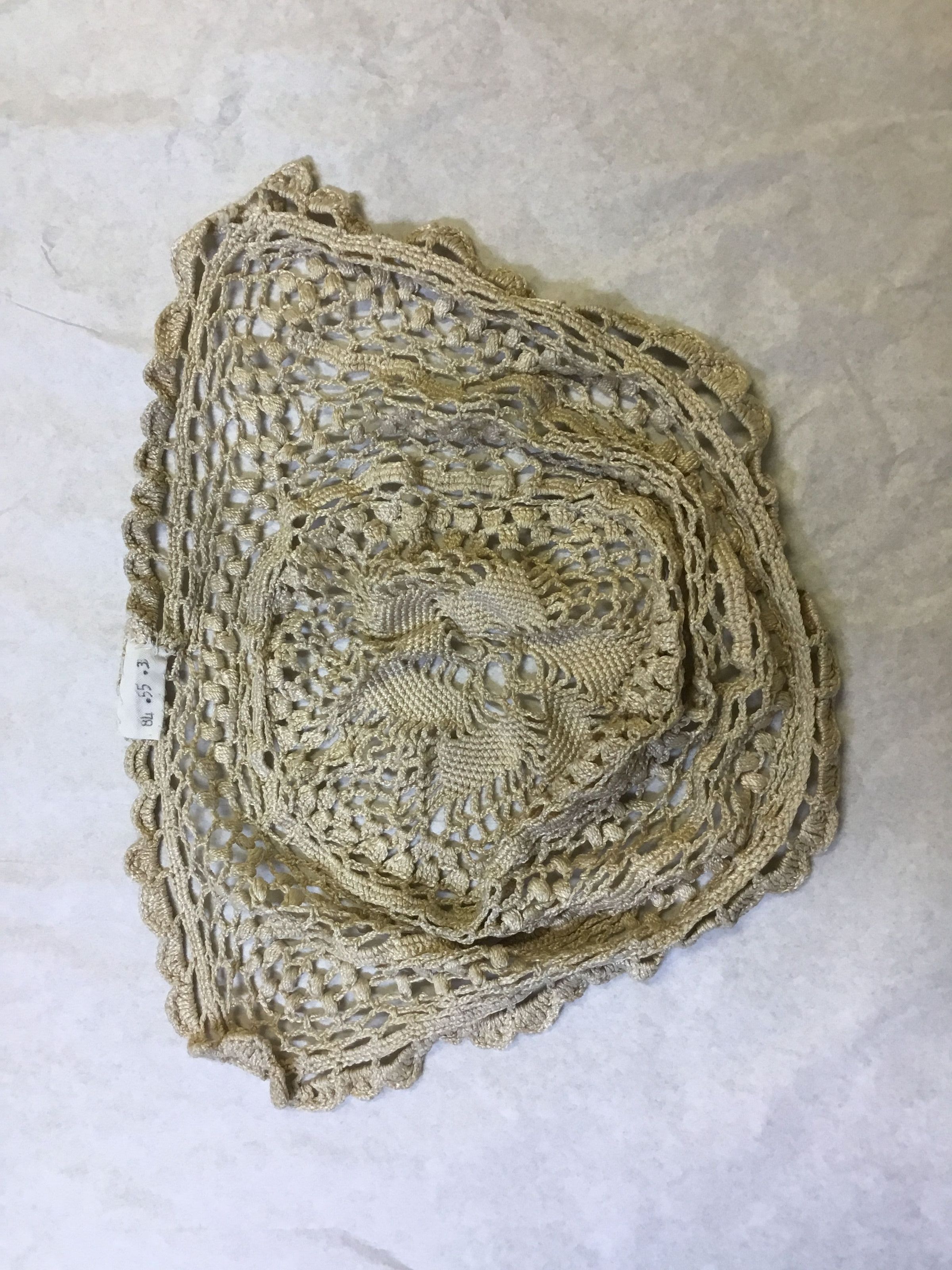 Crocheted baby cap; natural color; circle center design; two sections on brim with scalloped edge completely around the cap.Collection