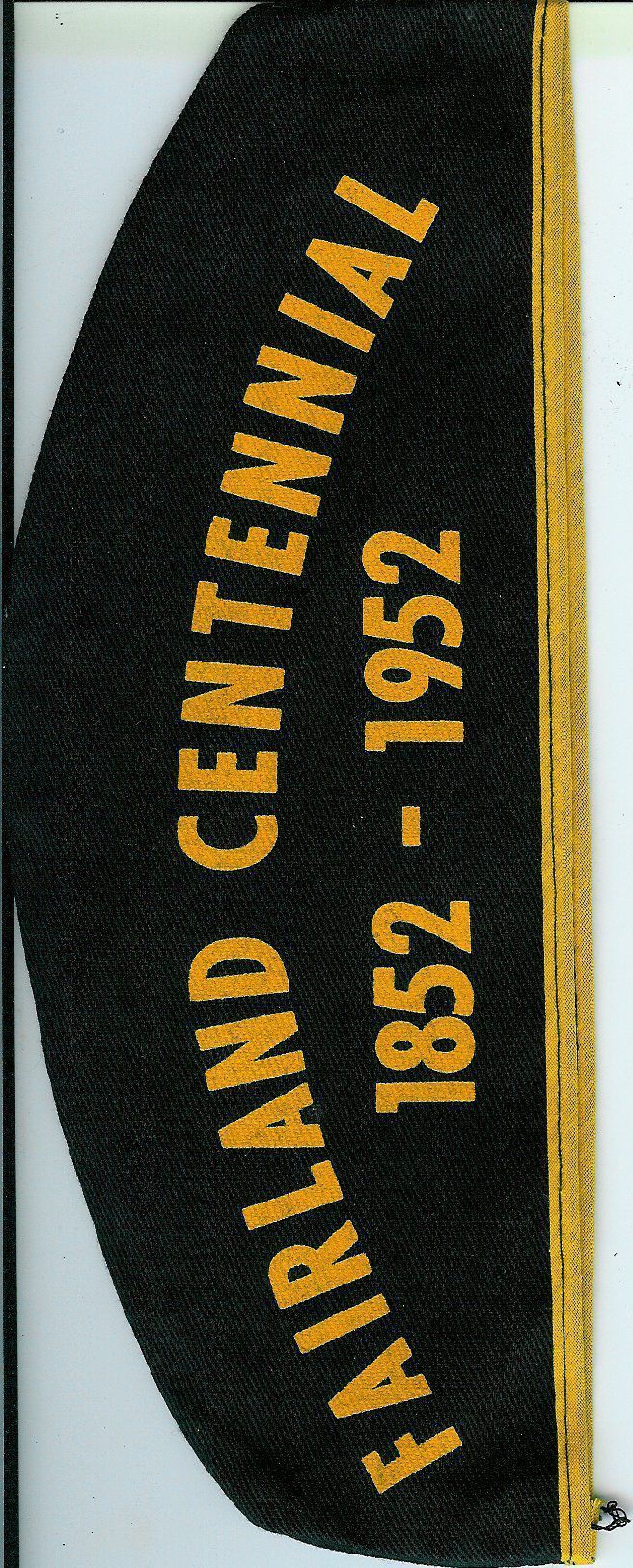Hat, celebrating Fairland Centennial 1852 - 1952. Black Material with Gold lettering. 11" x 4" at the widest point of crown.Collection