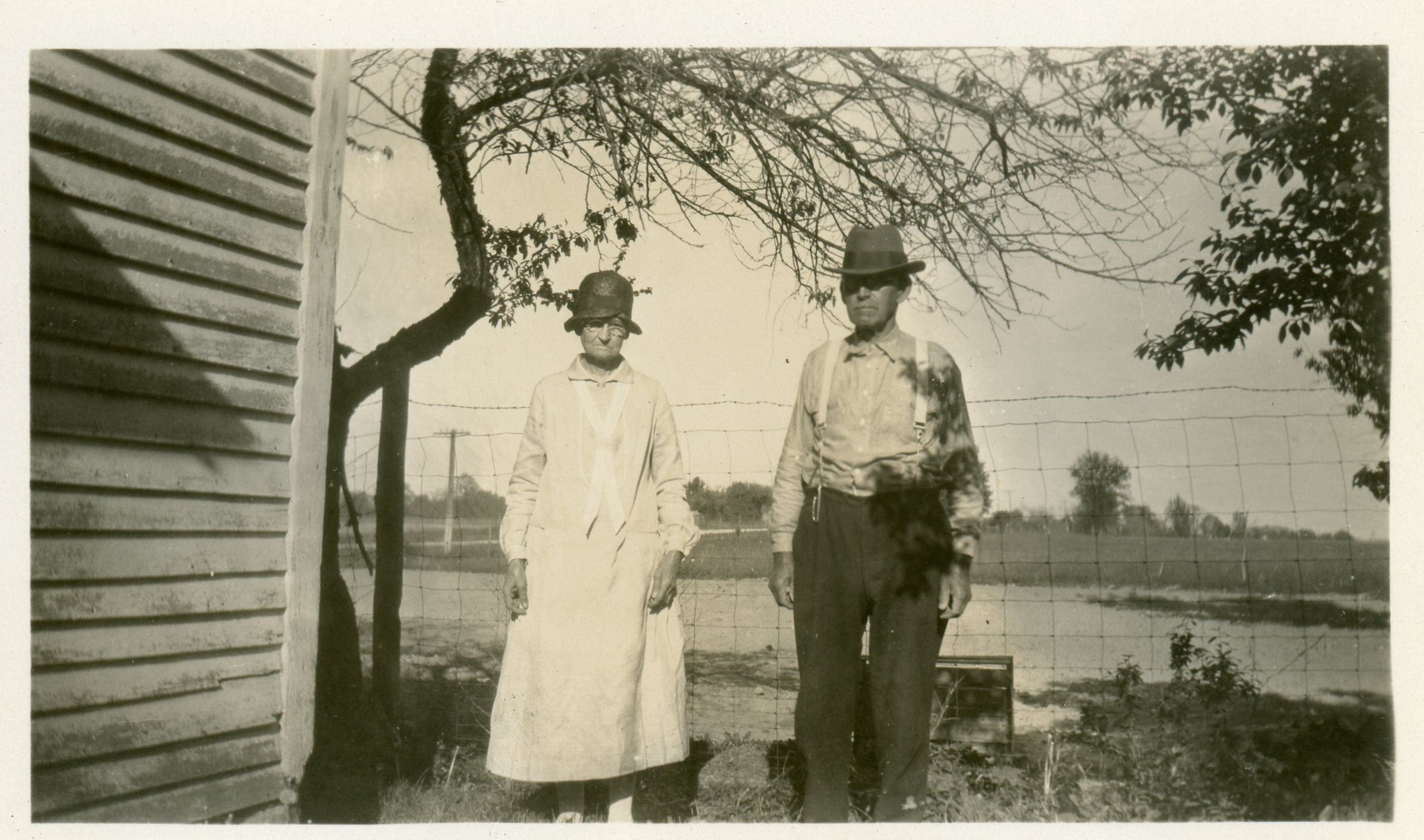 A black-and-white snapshot of a woman (left)) and a man (right). They stand in front of a wire fence. Both are wearing hats.Photograph Details