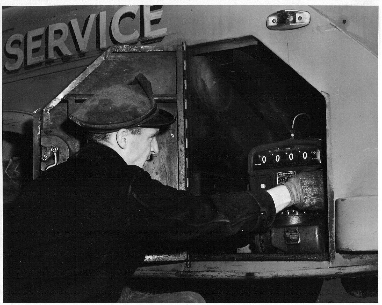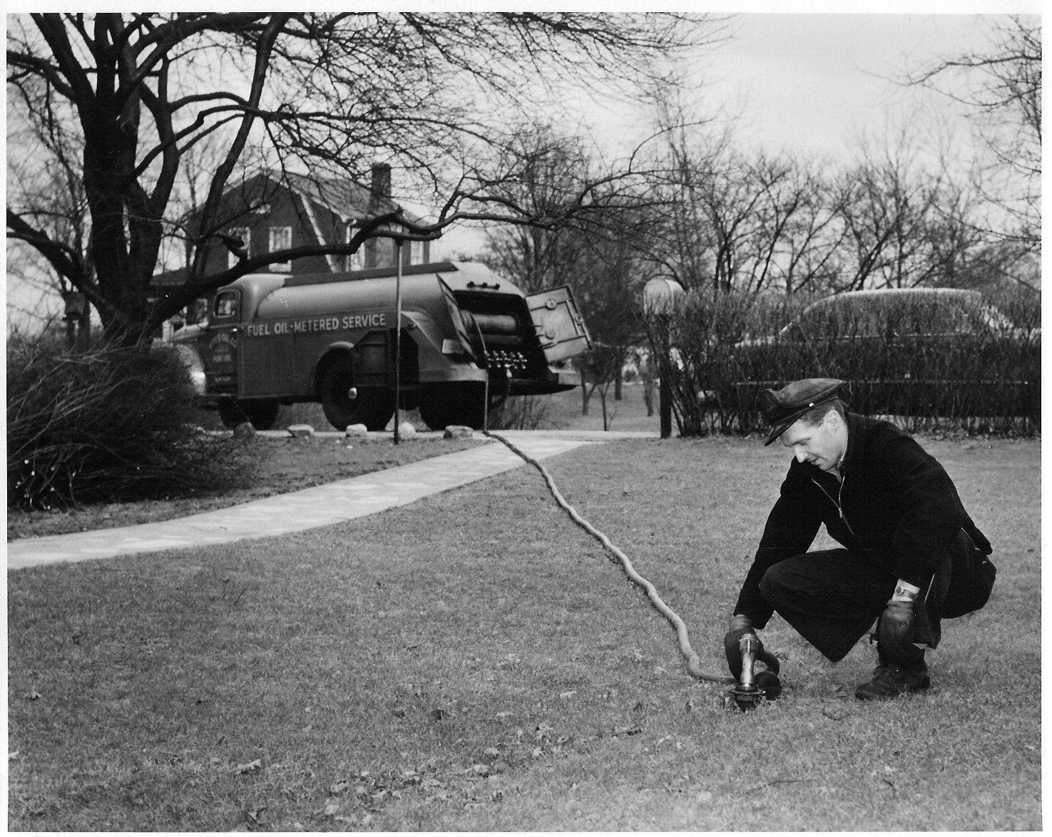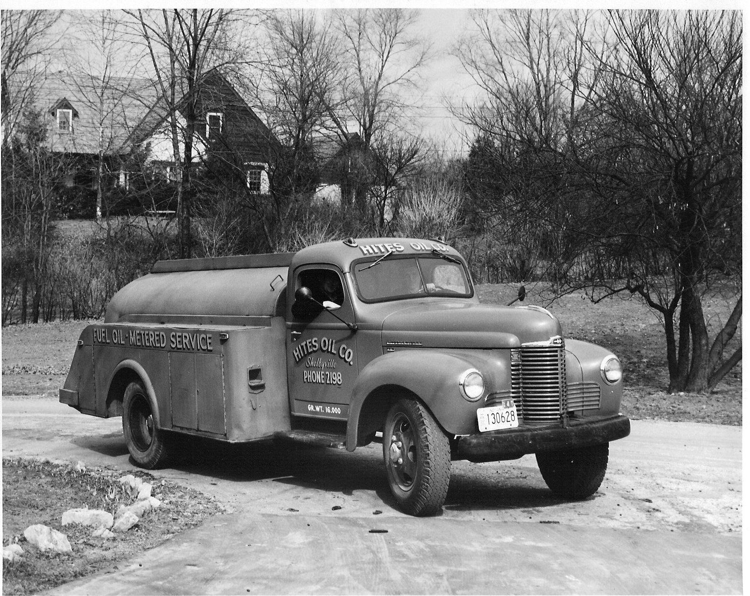 Black and white photographic prints of the HITES OIL COMPANY TRUCK/262 E. BROADWAY/SHELBYVILLE/PHONE 2198. A: Passenger-side view of the Hites Oil Co. delivery truck B: Close-up of meter inside side panel on truck, man reaching in with right hand, gloved. C: Delivery man dispensing oil into opening in lawn, hose stretched from delivery truck which is parked in street.Collection