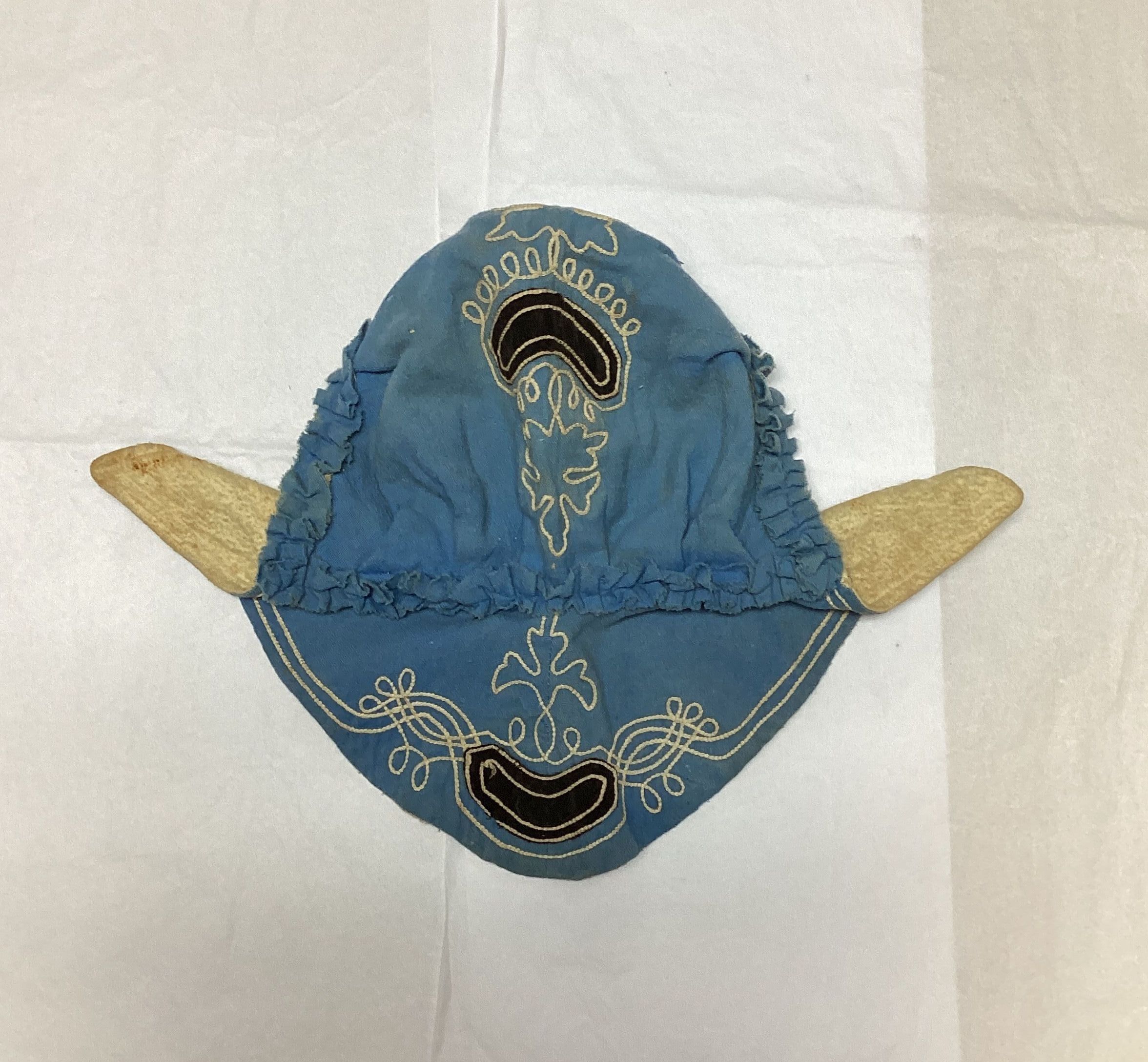 Child's wool hood; hood is 8" long, collar 4" wide & 24" long; it is light blue in color and has chain stitch design on back and around edge of collar, there is black trim under the stitching; small ruching around front and buttons; lined w/natural color flannel; inside has bound seams; blue stitching on inside, white on outside; front of hood is small gathered piece of blue cloth that doesn't quite match; handmade except for chain stitch.