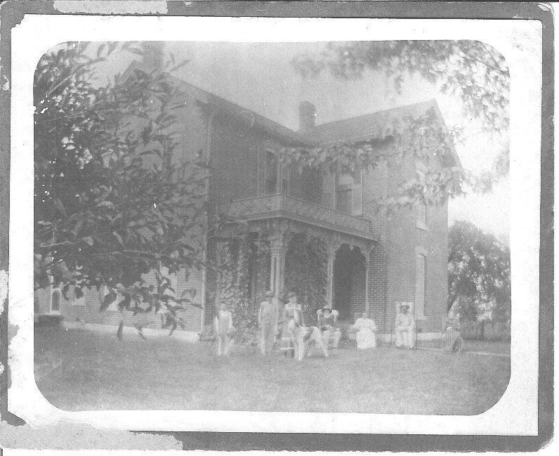 Black and white photographic print of a brick Italianate house with 7 people in the yard at the front of the house. Two males, a female, a large dog are to the left of the group. Other four people are seated, one may be in a wheelchair. Porch of the house has vine-covered trellis. Branches of two trees in foreground of photo. Plants are in summer foliage. Print is grainy or out of focus. House has been identified as the HORD SANITARIUM, W. FRANKLIN ST., SHELBYVILLE, IN.Collection