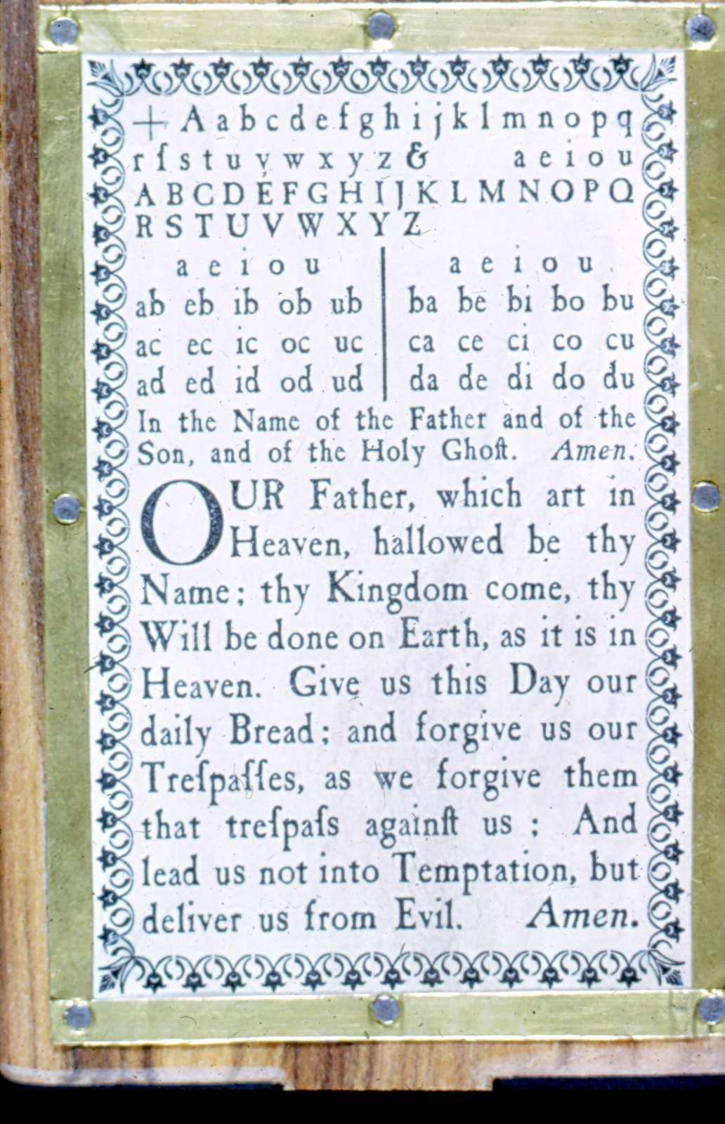 In image are the Lord's Prayer, the alphabet and the vowels.Collection