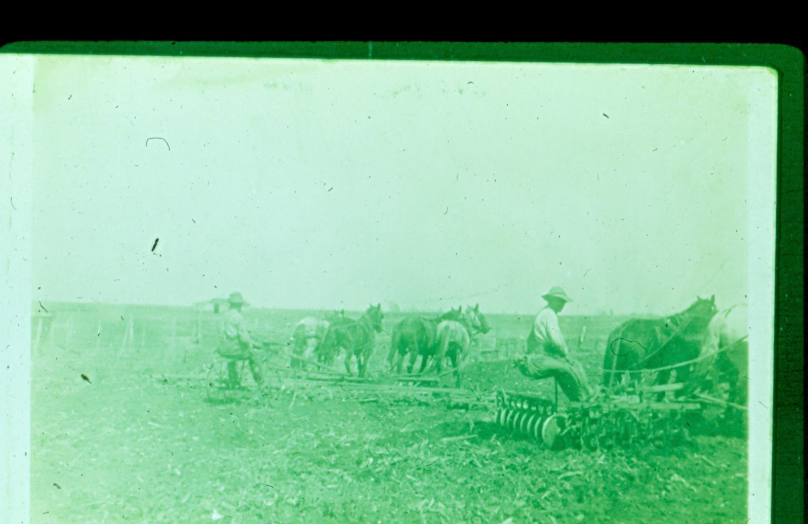 Donation, 07/26/2005. Black and white photographic slide in landscape format. Slide frame is marked: "Horse-drawn Disk."Collection