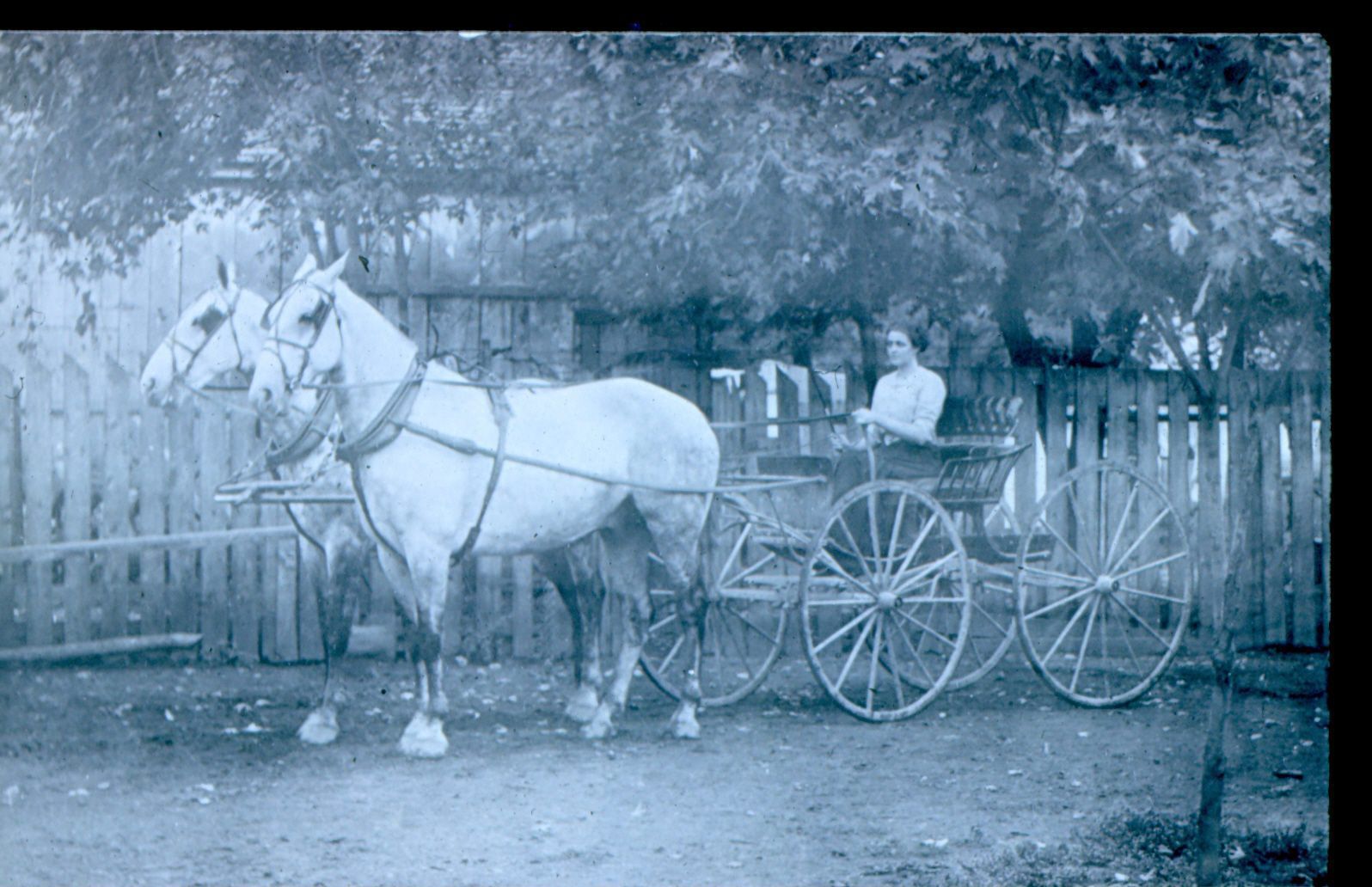 Donation, 07/26/2005. Black and white photographic slide in landscape format. This is a slide of a photograph. Slide frame is marked: "Miscellaneous/team horses to buggy."Collection