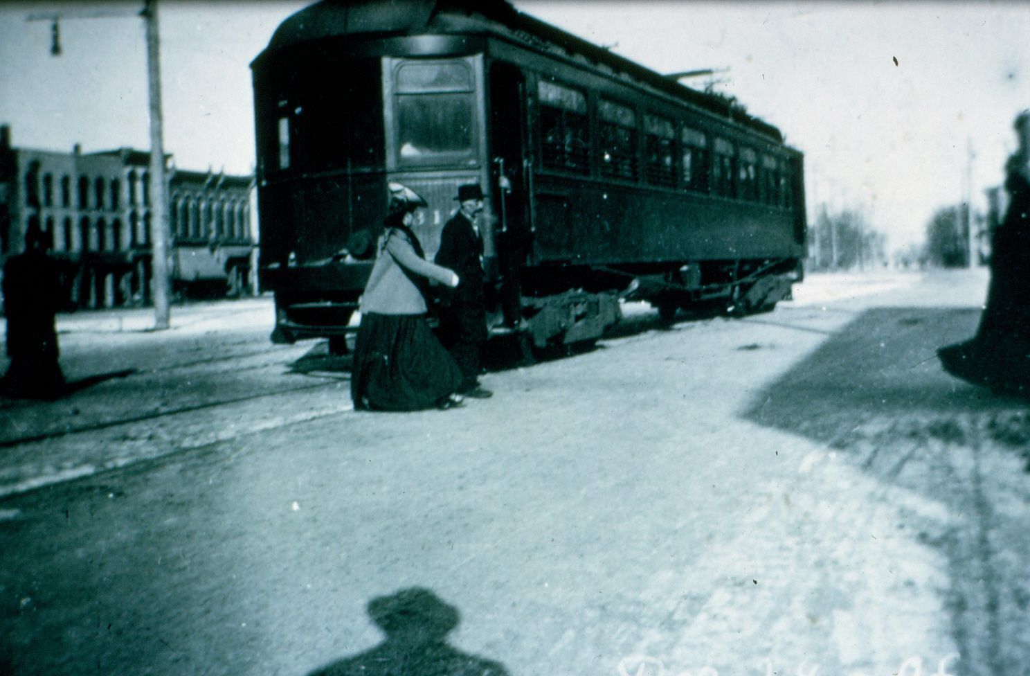 Black & white; interurban car stopped on a wide street; man & woman walking by end of car partially obscure car's number it is "31?"; to left of car is utility pole w/beam set at right angle & something suspended from beam; row of buildings in background on left side; center foreground has man's shadow (probable picture taker) white lettering lower right corner reads "Dec. 18, 06"