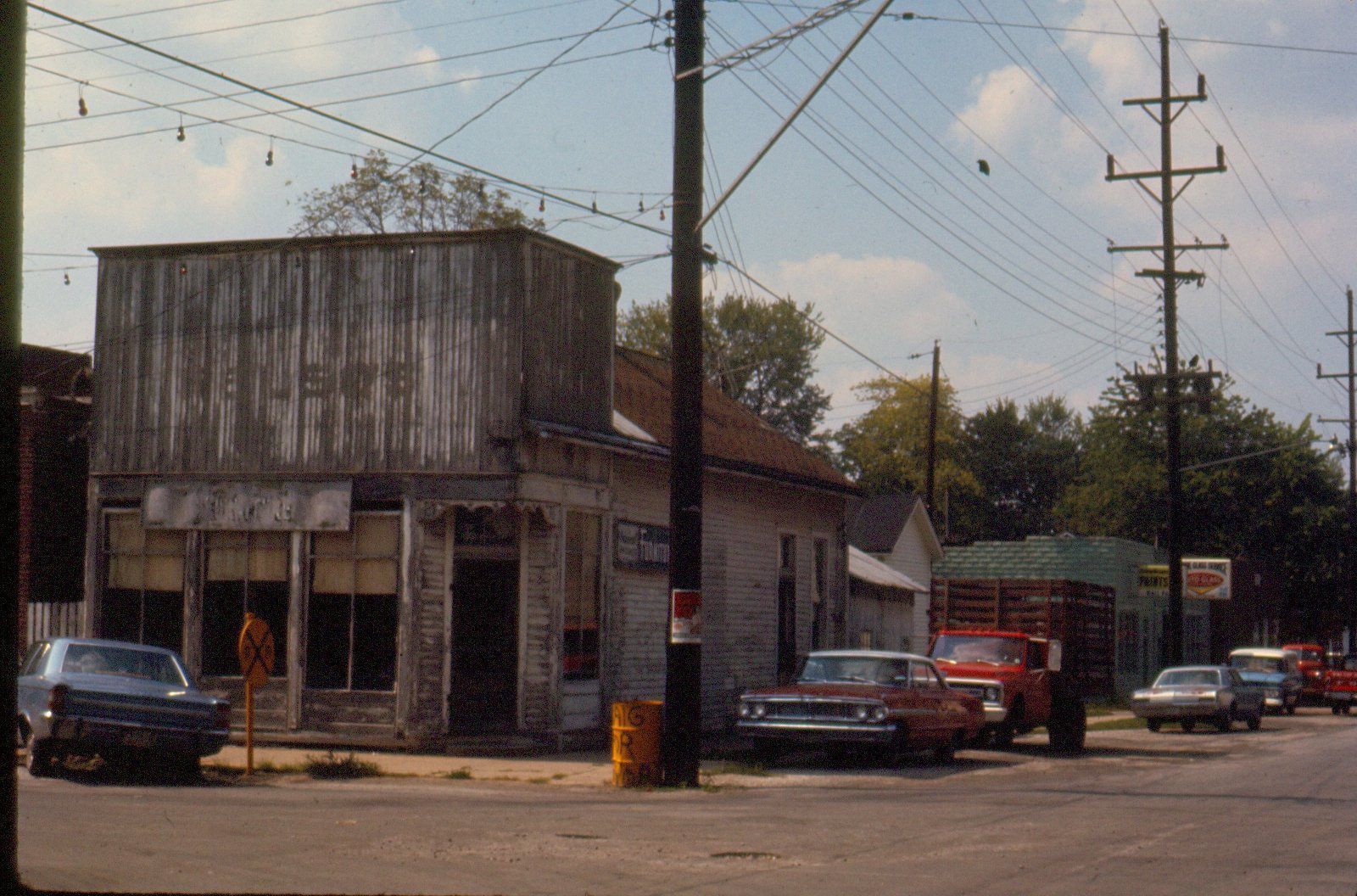 Color; Street corner; dilapidated building, has corner entrance, frame construction, clapboard siding, some gingerbread over doorway, slope roof although front has vertical extension that hides roof; sign on right side of building says furniture, other signs too faded to read; sindle car parked in front, cars & trucks parked along sides; railroad crossing sign by car in front; trash barrel by utility pole.