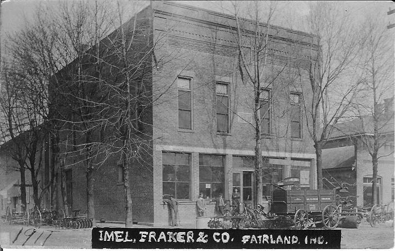 Black and white photo of a 2-story brick building; farm equipment-type wagons, plows and discs along the front and side; 4 men are lounging in front of the building; in center of 2nd story is a white plaque marked "F.O.B./1906". Trees are all leafless; at bottom of print is black and white lettering which identifies building as 'IMEL, FRAKER & CO. FAIRLAND, iND.Collection