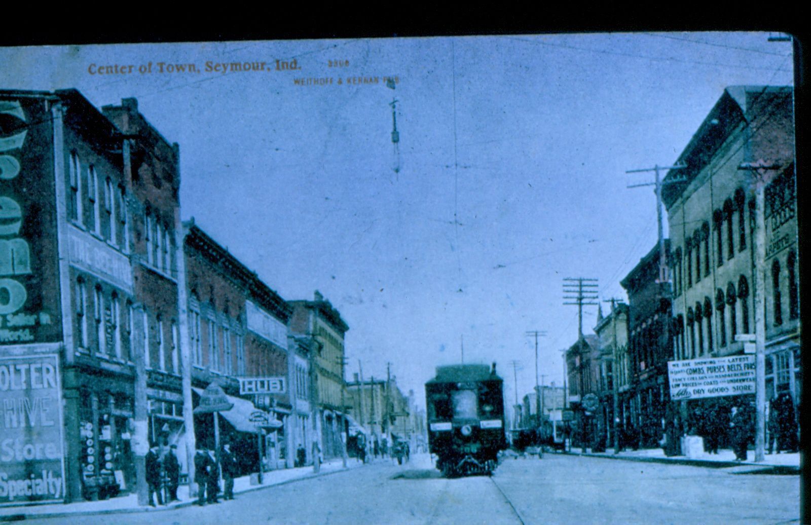 Donation, 07/26/2005. Color photographic slide in landscape format. This may be a slide of a postcard. On slide frame: "Indianapolis-Louisville Traction at Seymour, Ind." Marked on image: "Center of Town, Seymour, Ind."Collection