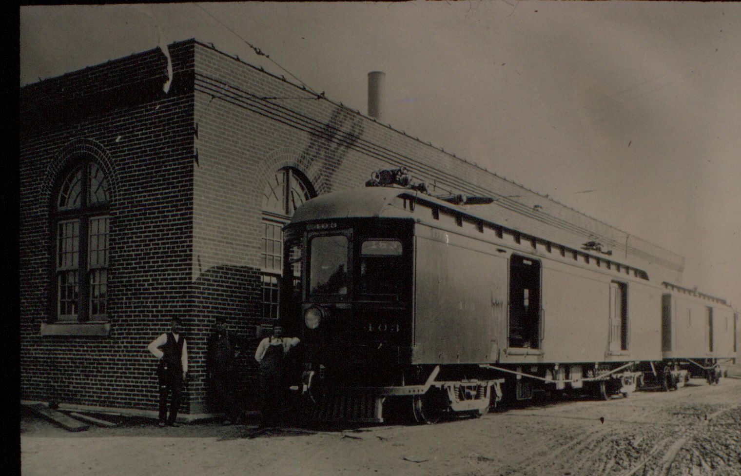 Black & white; interurban freight car & trailer parked beside brick building; 1 side door on freight car is open and car is numbered "403" has round headlight below motorman's center window; 3 men visible, 2 are leaning on either side of building corner, other man wearing bib overalls has left arm propped up on interurban car; building has large arched windows; corbelling below parapet & title caps on top of parapet; upper left corner shows white curve where original print was damaged.