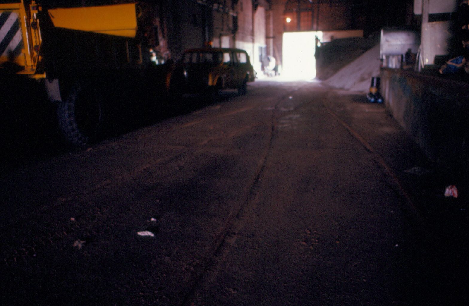 Color; inside brick structure; far end has open sliding door & above that an arched window although window appears blocked from outside; to left are 2 highway maintneance vehicles; to right a concrete dock w/various items on it, at end of dock is large pile white substance, probably salt; floor shows 4 sets of grooves; 2 grooves on left are parallel & disappear under the salt pile, 2 grooves on right parallet but curve towards & merge with other set.