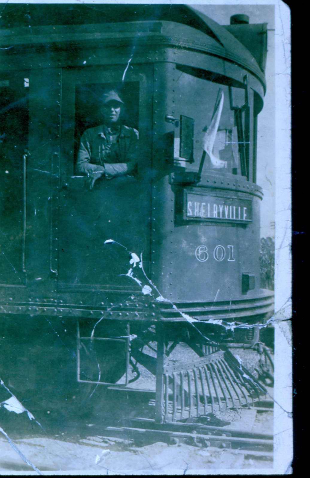 Mr. Donica in picture." In image is car #601, Shelbyville and a man in the window looking out at the camera.Collection