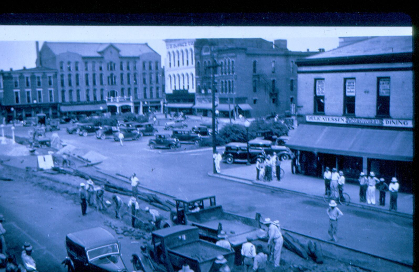 Donation, 07/26/2005. Black and white photographic slide in landscape format. Slide frame marked: "Tearing up of Interurban/tracks near P.S./1932."Collection