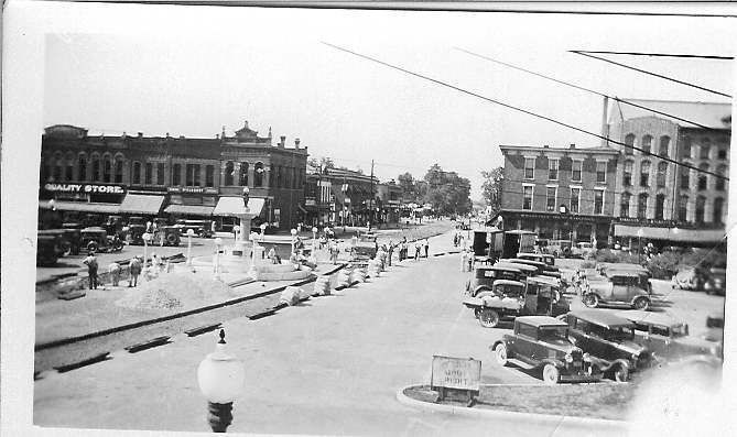 Donation, 07/26/2005. Black and white glossy photographic print in landscape format. On back: "Summer of/1934/removing/Interurban car track/and cementing space-/also streets/resurfaced summer/1934". Image is of South Harrison looking North through Square.Collection