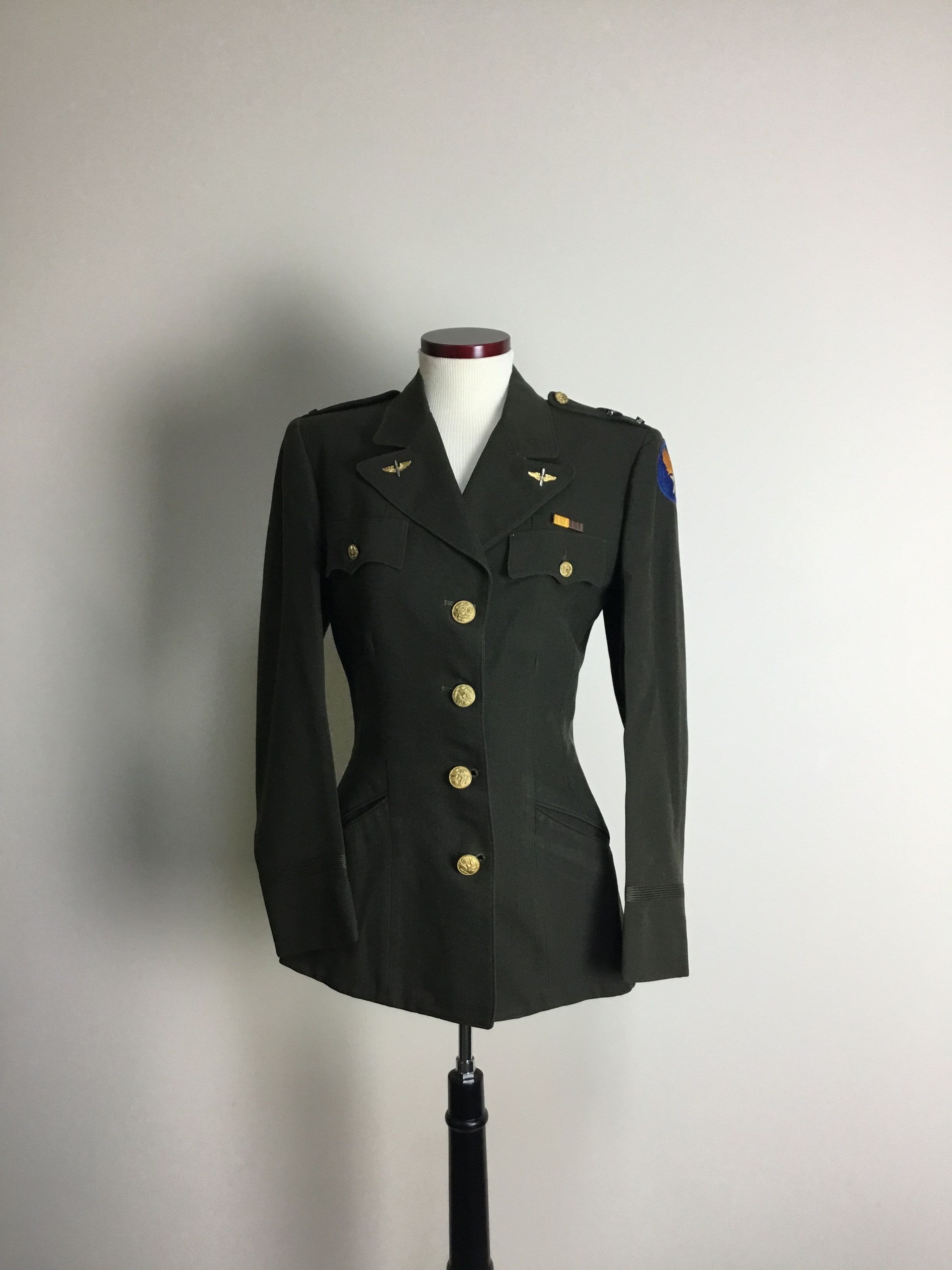 Women's WAAC dress uniform jacket. Gold insignia U.S. on lapel & wings. Silver bar and silver/red/white/blue pin on shoulder. Blue/yellow/white/red patch on sleeve. Brown and yellow bar on chest.Use