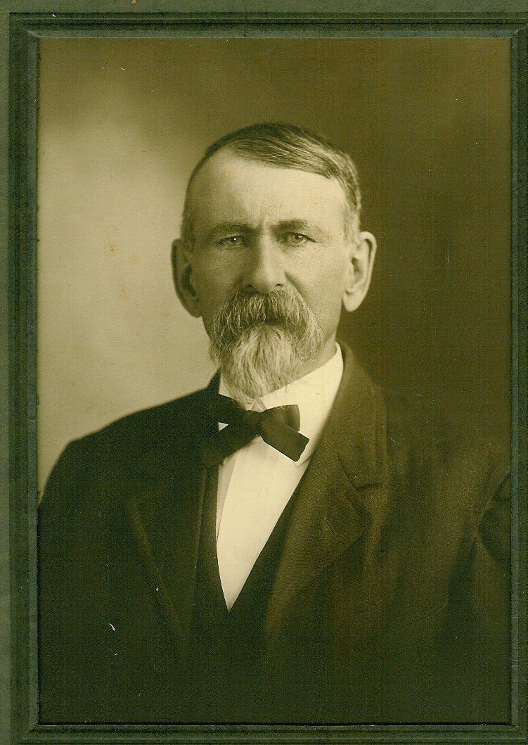 Black and white photographic print. In a folder, some rosy-pink border on it. Fhe folder has some brown-gray-pink mixed throughout. The picture is of a man with a gray beard and mustache. He has on a dark suit and bow tie. "Thomas Jacklin/The Orebaugh Studio, Shelbyville, Ind." Found at a sale.Collection