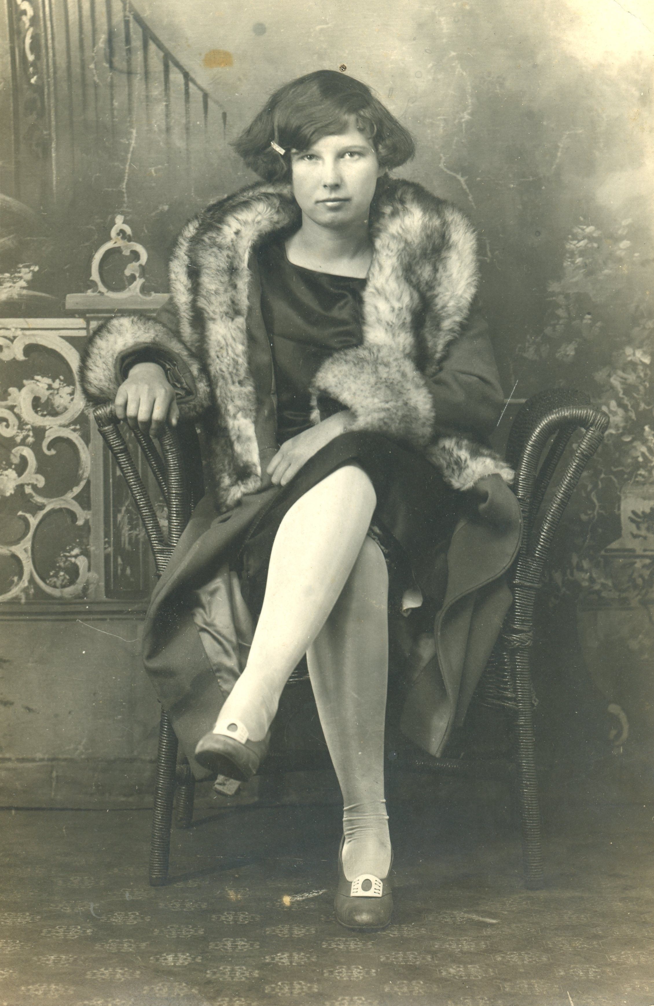 Photo of a young woman, James Laurence's Daughter, as noted on the back. Sitting in a wicker chair with legs crossed. Coat trimmed in fur and shoed with buckles on the front.Collection