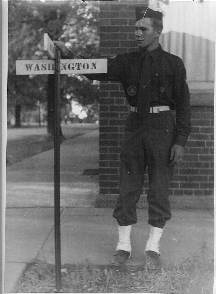 B&W photo; man standing by street sign with his hand on the sign, he is dressed in a uniform, brick type building in background, sign reads "Washington"Collection