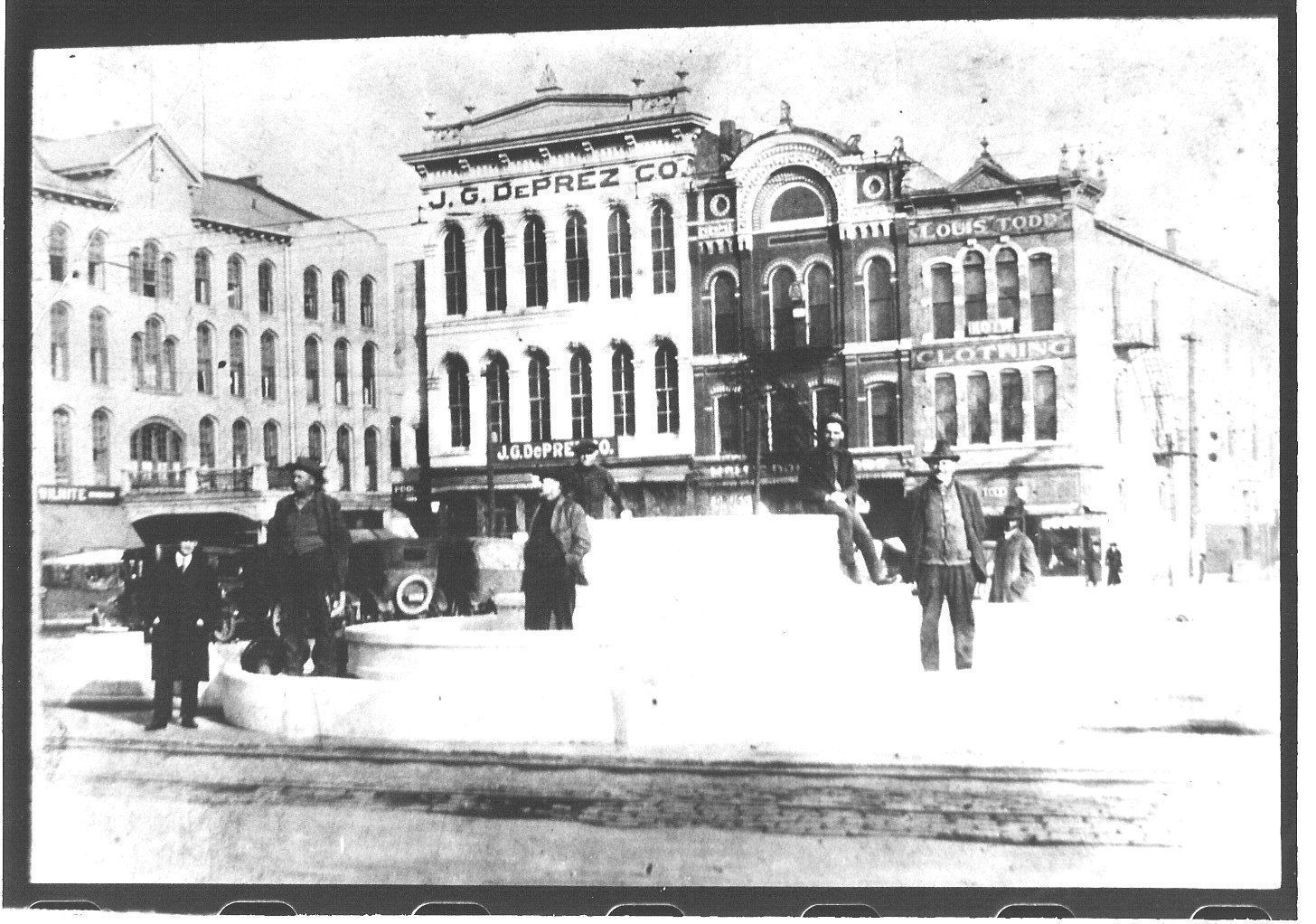 Donation, 07/26/2005. Black and white glossy photographic print in landscape format. On back in ink: "Building of Joseph Fountain on Public Square 1922/Shelbyville, Ind." Several men standing on what has been built as the base of the Joseph Fountain. In background is the J. G. DePrez Co., The Shelby Hotel, the Louis Todd Clothing Store.Collection