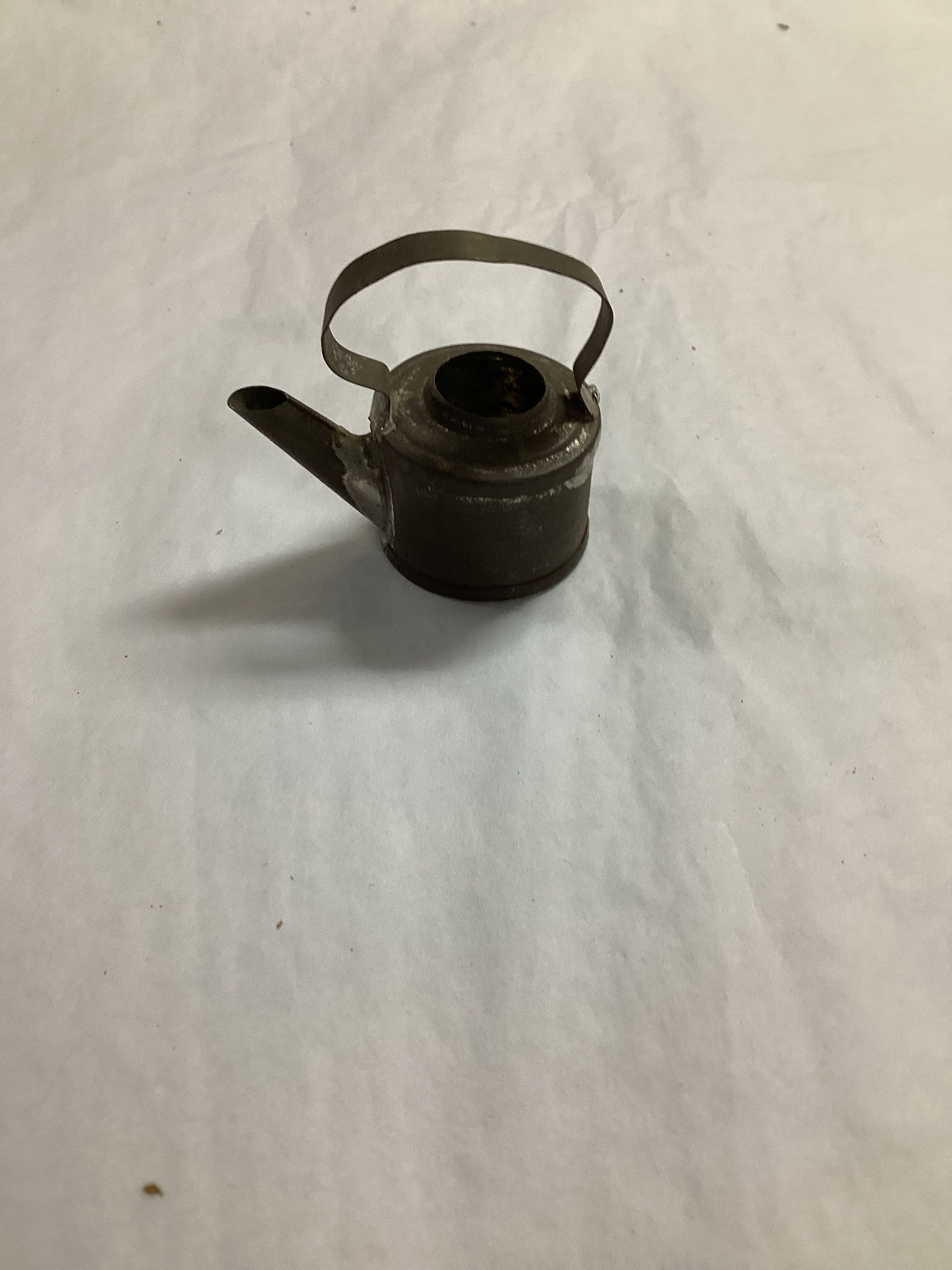 Tea Kettle; doll-size, bottom piece is round and stamp formed; top is round and stamp formed also; side is one piece curved around to meet itself and soldered at that joint; side is held in place between the top and bottom pieces by flange edged on each of these pieces; flange on top piece is crimped in a few places to get better girp; spout soldered on opposite side joint; top piece has a hole in center where lid would have set, lid is missing; handle is flat wire arched over top piece and soldered to it;Collection