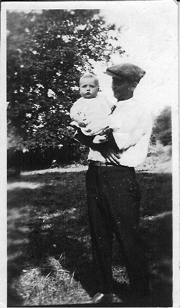 Blssck & White snapshot of man holding a baby:man wearing a cap and dressed for summer; baby is barefoot; man's facial detail is lost because of shadow; picture taken outside with large tree in background. Written on back in blue ink "Louis Grover with his son Dwain".Photograph Details