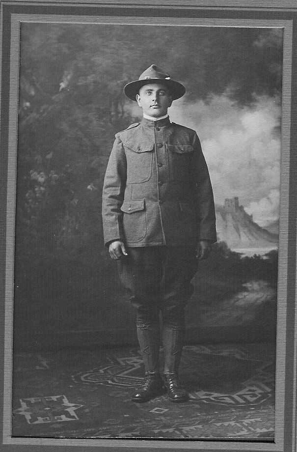 Photographic print of Louis H. Grover in his WW I Army uniform standing in front of a mountain scene backdrop, floor also has a very noticeable design. The print is either sepia or gold-toned; print is held in the folder by a gray mat which has brown/gold stripes for decoration; folder is between brown and gray in color and has a raised varied-width vertical line pattern; front cover has embossed profile of long-haired young woman in classical dress blowing 2 trumpets. On mat board underneath print it reads: "NATIONAL STUDIOS/444 S. Fourth Ave. /Louisville, KY. Someone, probably donor, wrote on back of folder "Louis H. Grover,1917, Camp Knox, Ky." Donor was Louis H. Grover's widow.Photograph Details