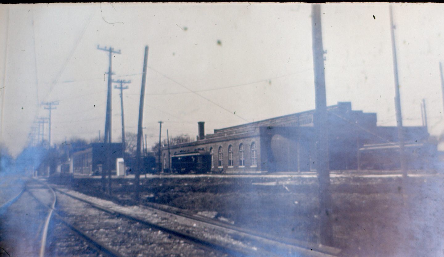 Black & white; foreground 2 railroad beds that are switch tracks; background large brick building, 3 bays w/center section higher than other 2; center section has stepped roof line; image is back lit no front details visible on building. left side of building has 5 arched windows visible; 1 interurban car parked on left side of building and 1 parked in front; many utility poles & lines visible in image.