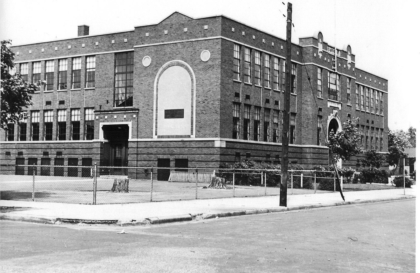 Black and white matte-finish photographic print in landscape format. Image is of the Charles Major Elementary School on the corner of Franklin and Pike Streets. The statue stood on Franklin Street, on the Right in the photograph.Collection