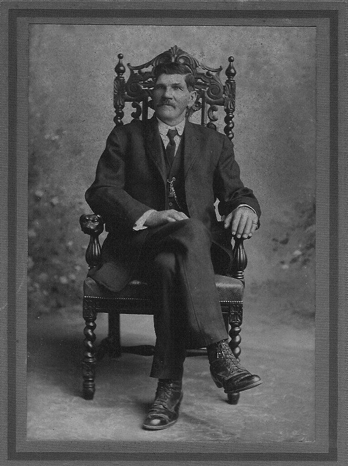 Black and white portrait in landscape format. Image shows a man seated in an ornately carved chair with his legs crossed.Collection