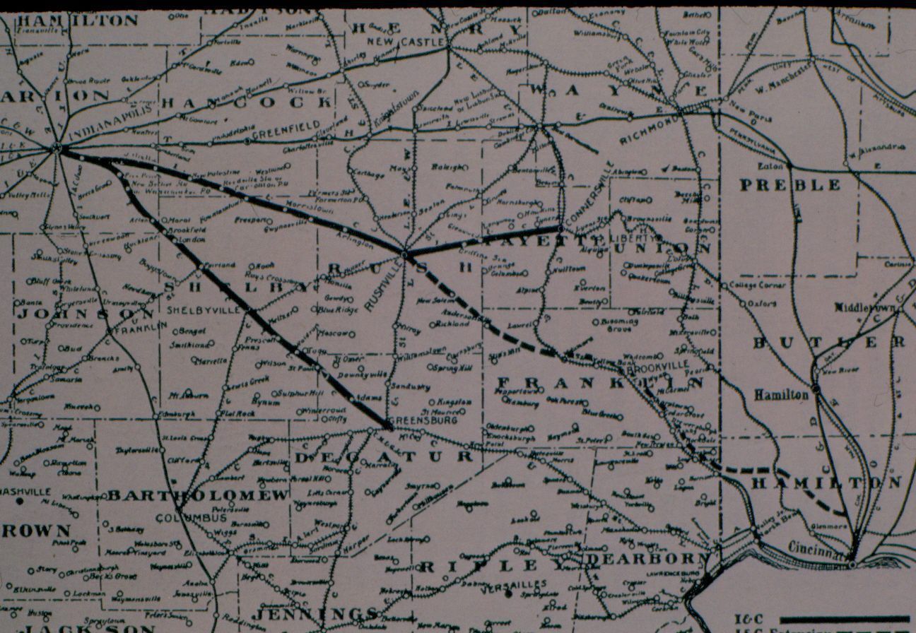 Black & white; map of Southeastern quarter of Indiana from Indianapolis to Cincinnati depicting routes of various rail & interurban lines.