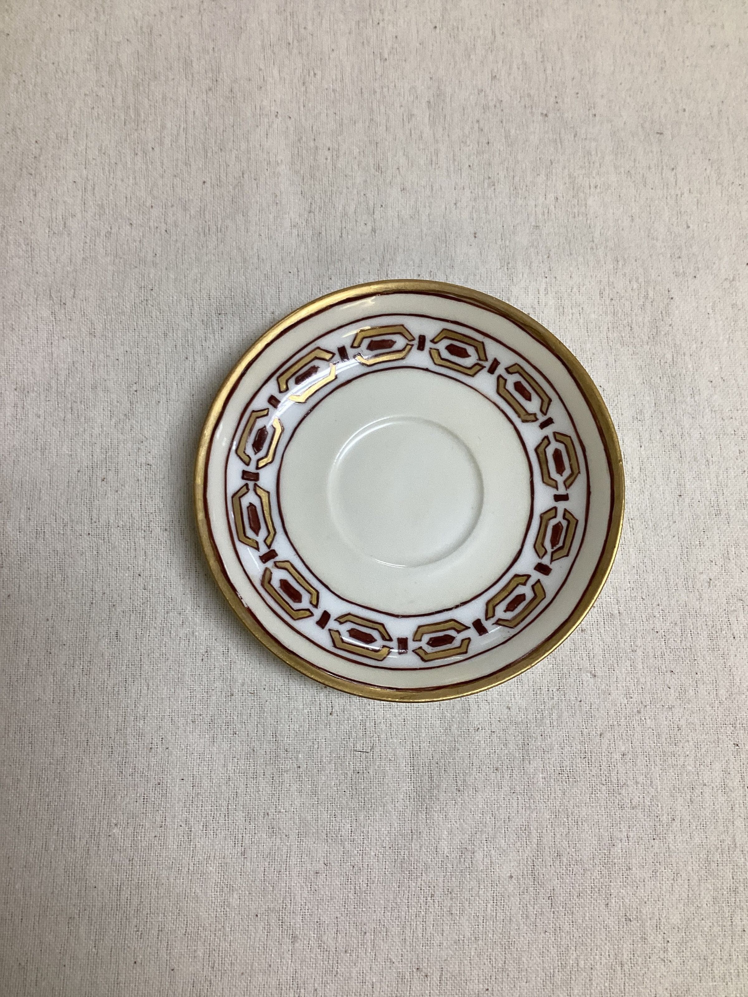 child size white china tea cup saucer; has 3" diameter base and 4-1/2" diameter top; saucer decorated with china painting consisting of a gold band along outside rim which is edged at its bottom by a brown line, then a white band 9/16" wide which has a brown line at its top and bottom, decoration on white band is 2 horizontal gold lines w/ends turned to each other and ellipsoidal figure in brown between lines; these alternate with vertical rectangular brown sections; underside rim of saucer somewhat iridescent