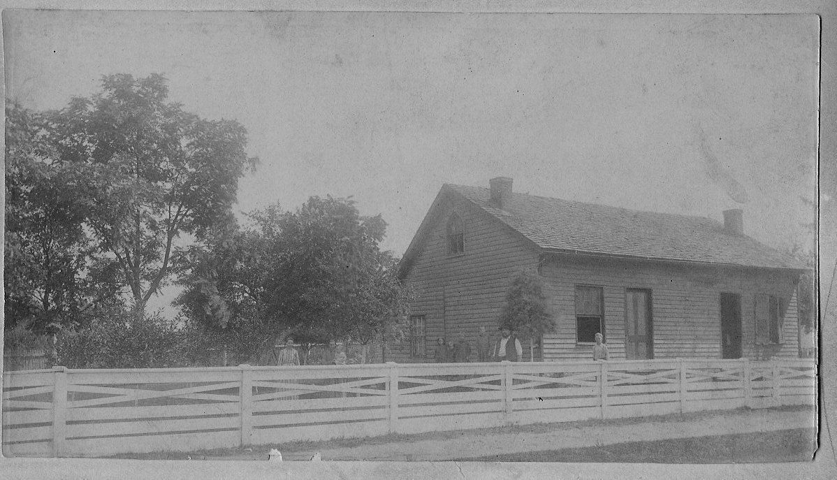 An exterior black and white of small frame house with 2 windows on front as well as 2 doors; 2 chimneys protrude from the roof; visible gable end has two windows on of which is a peaked gothic style in the loft area, the other window is a rectangle located near ground floor at back of house; there is a 4 board fence in front of house with 2 crossed boards between the top board and the one below it.. Trees are in full leaf; one man, two women with one woman holding a baby and 5 other children visible in print. Used by Daisy McBride (1874-1980). Donation, 02/13/1982. Donor received print after Daisy McBride died but is unfamiliar with the subject.Collection