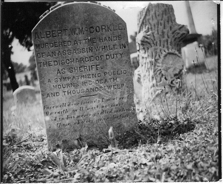 b & w print of tombstone for Albert McCorkle murdered at the hand of an assassin; McCorkle only Shelby County peace officer to die in line of duty; buried in City Cemetery, ShelbyvilleCollection