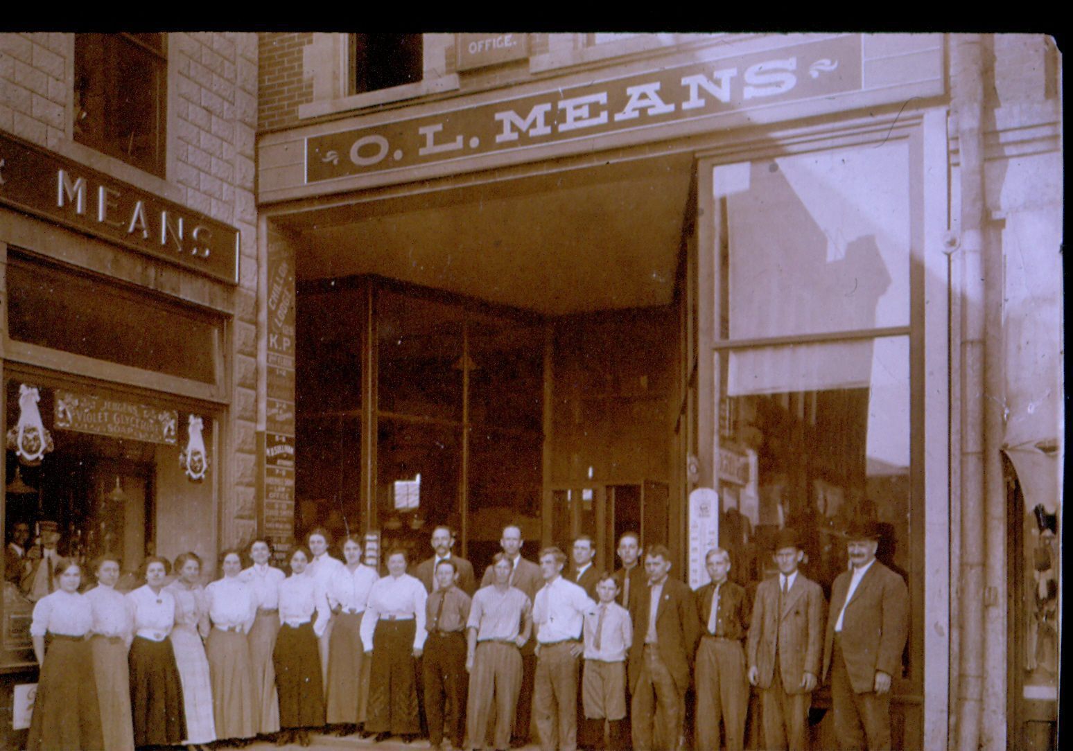Donation, 07/26/2005. Black and white photographic slide in landscape format. Slide frame is marked: "O. L. Means/S. W. Public Sq./About 1903."Collection