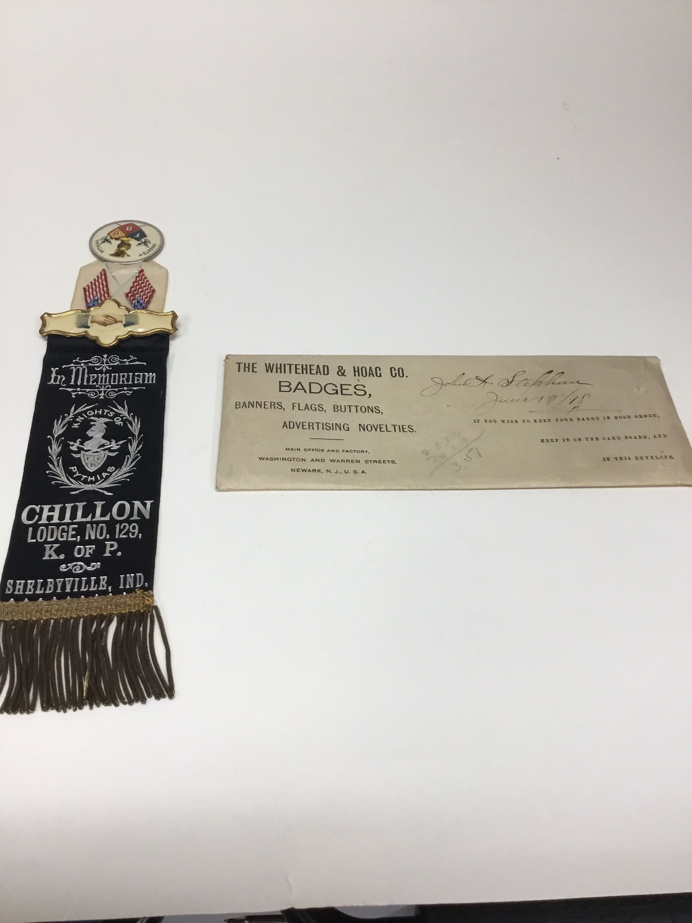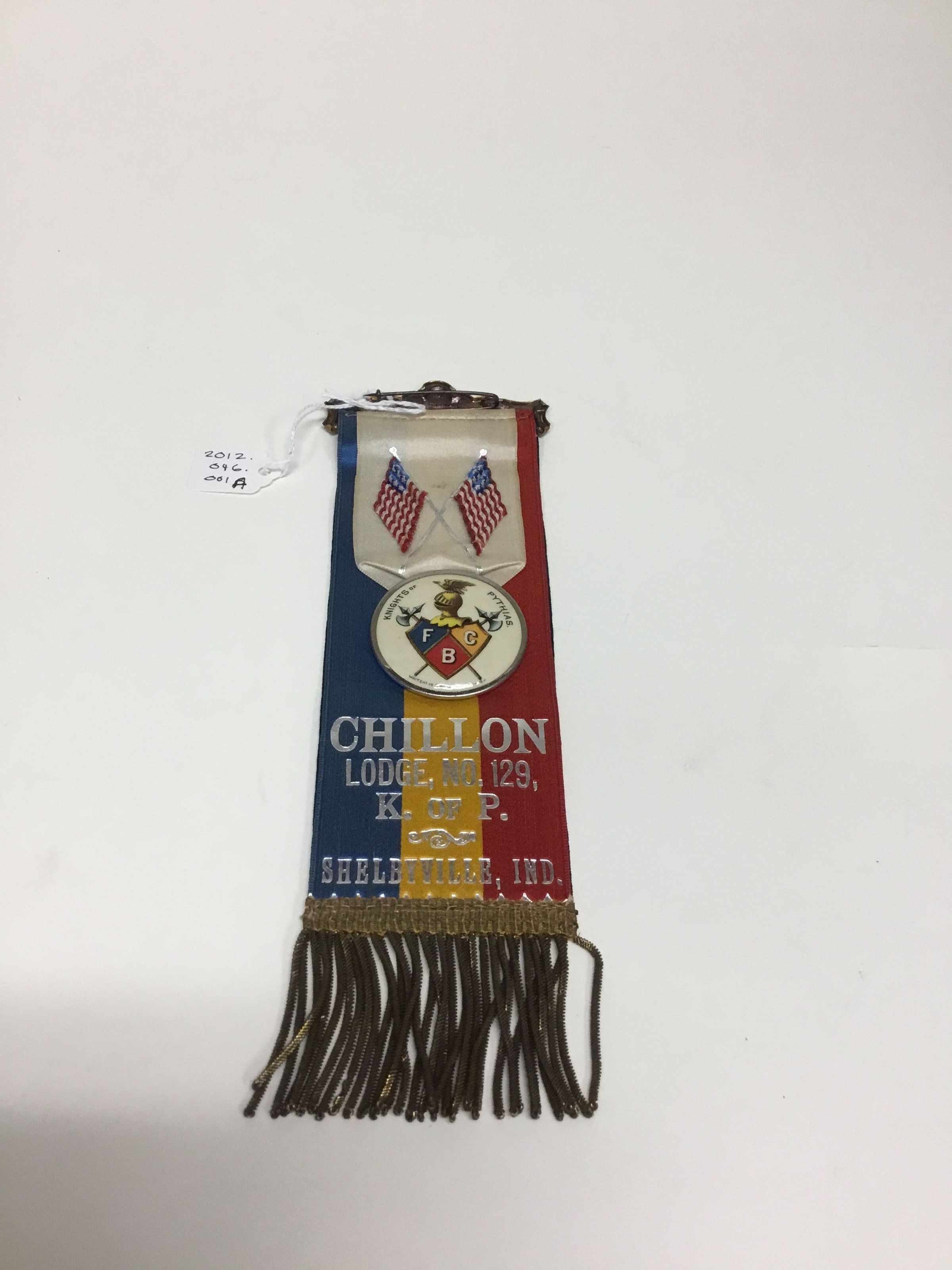 A. Knights of Pythias celluloid medallion on multicolored ribbon. This side of ribbon has the mechanism to be used as a pin. The flip side is black is In Memoriam. Fringe at bottom.