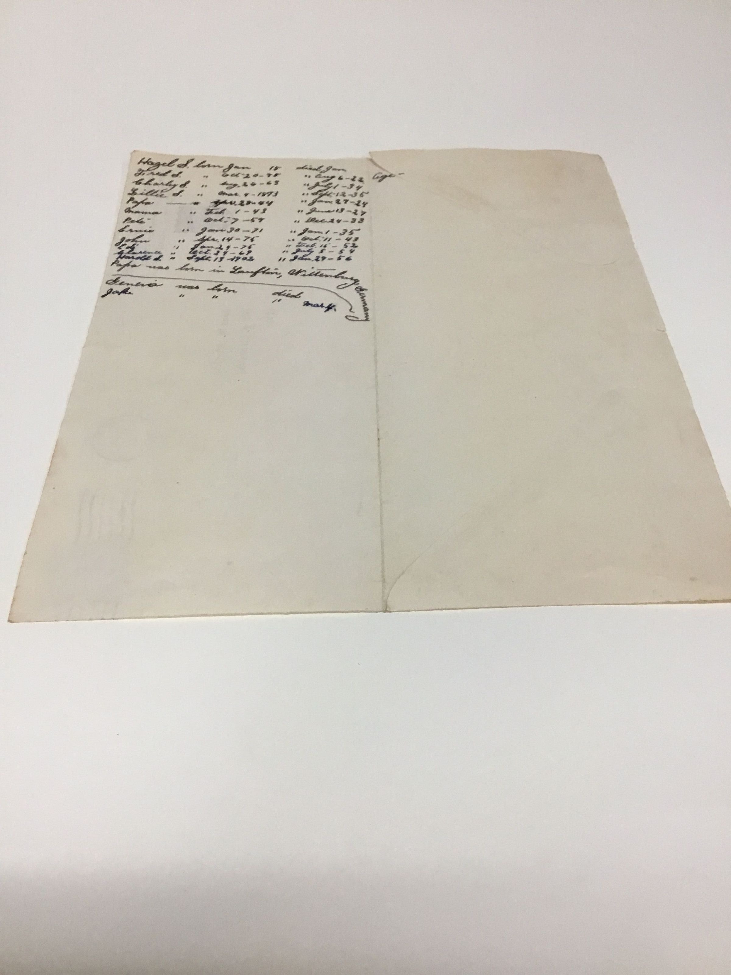 C. Envelope addressed to John A. Stephan. Inside is a list of people’s names, birth and death dates.