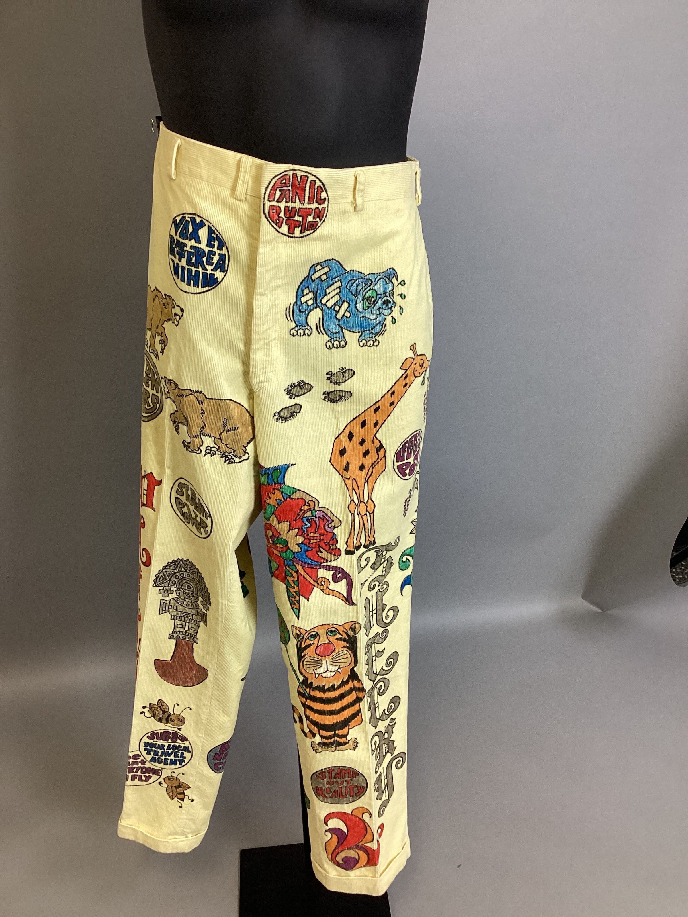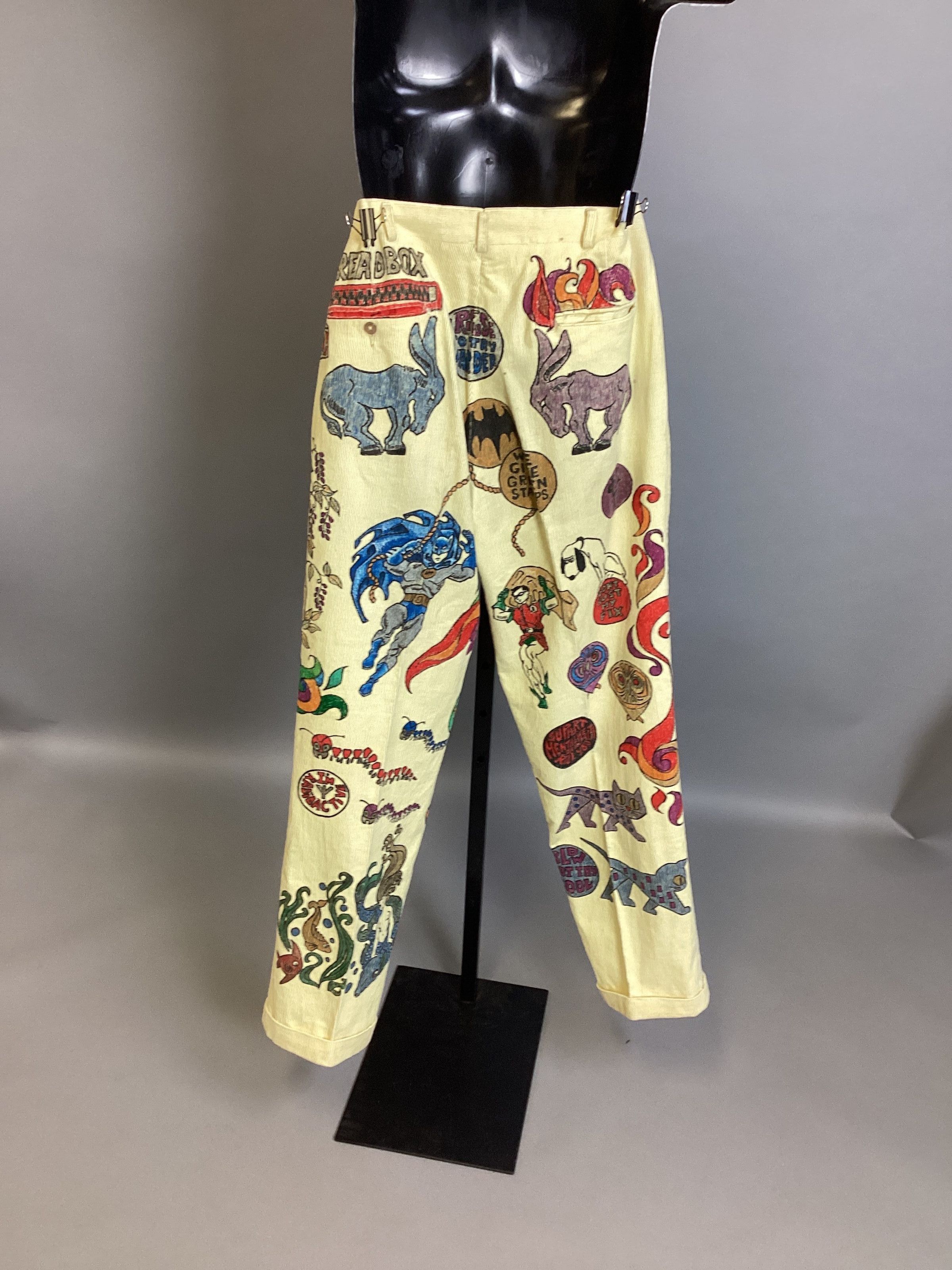 A pair of yellow corduroy pants decorated with all kinds of colorful painted designs. For photos of John wearing the senior cords, see: 1991.016.004.Use