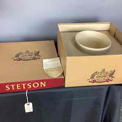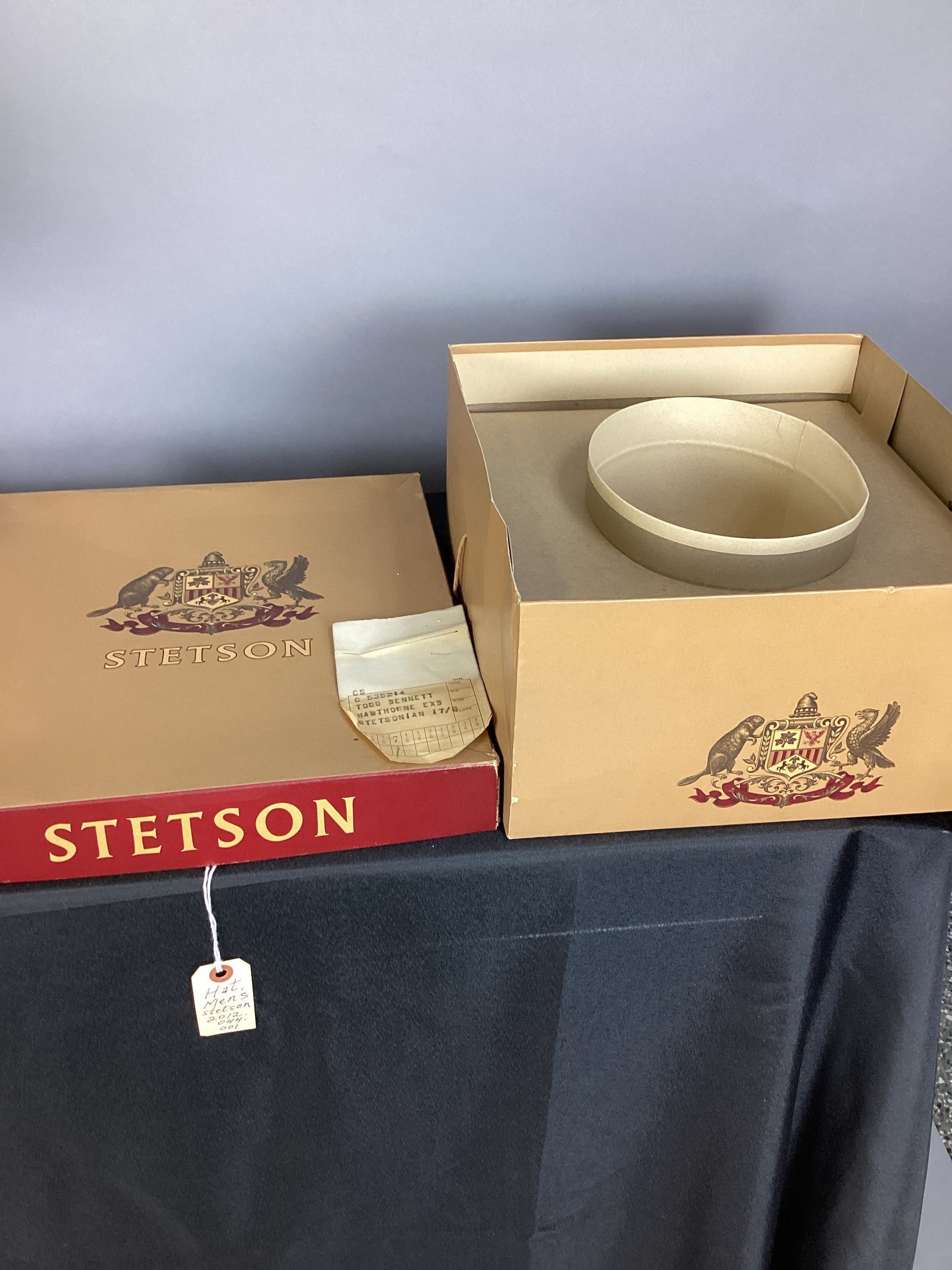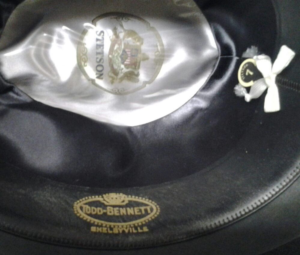 A dark grey beaver felt hat; signature design "Stetson." Inside labelling indicates Stetson 7, XXX Stetson, 3X Beaver Quality, John R. Stetson Company, with Shelbyville, Indiana clothier store Todd-Bennett, Shelbyville.Context