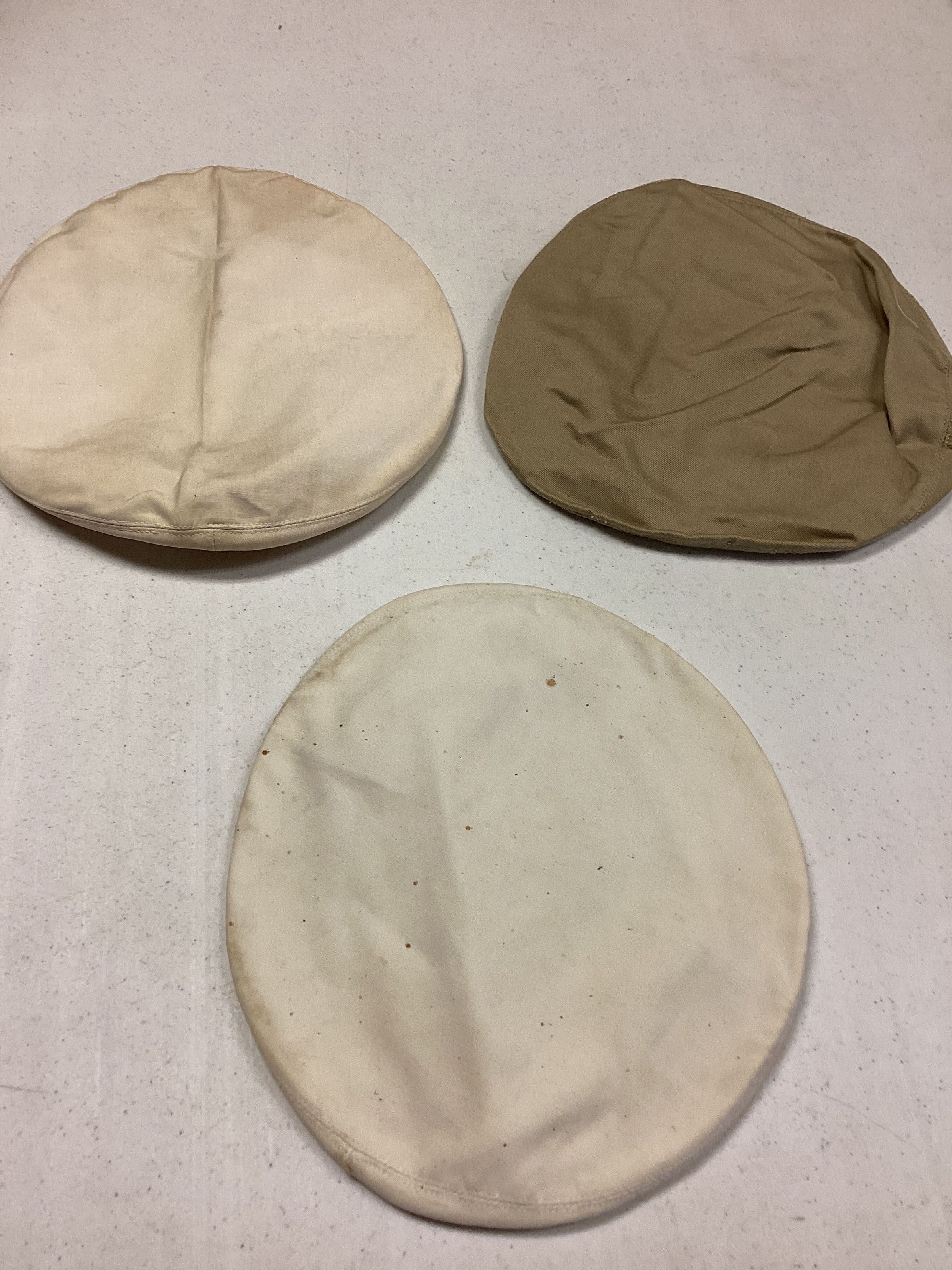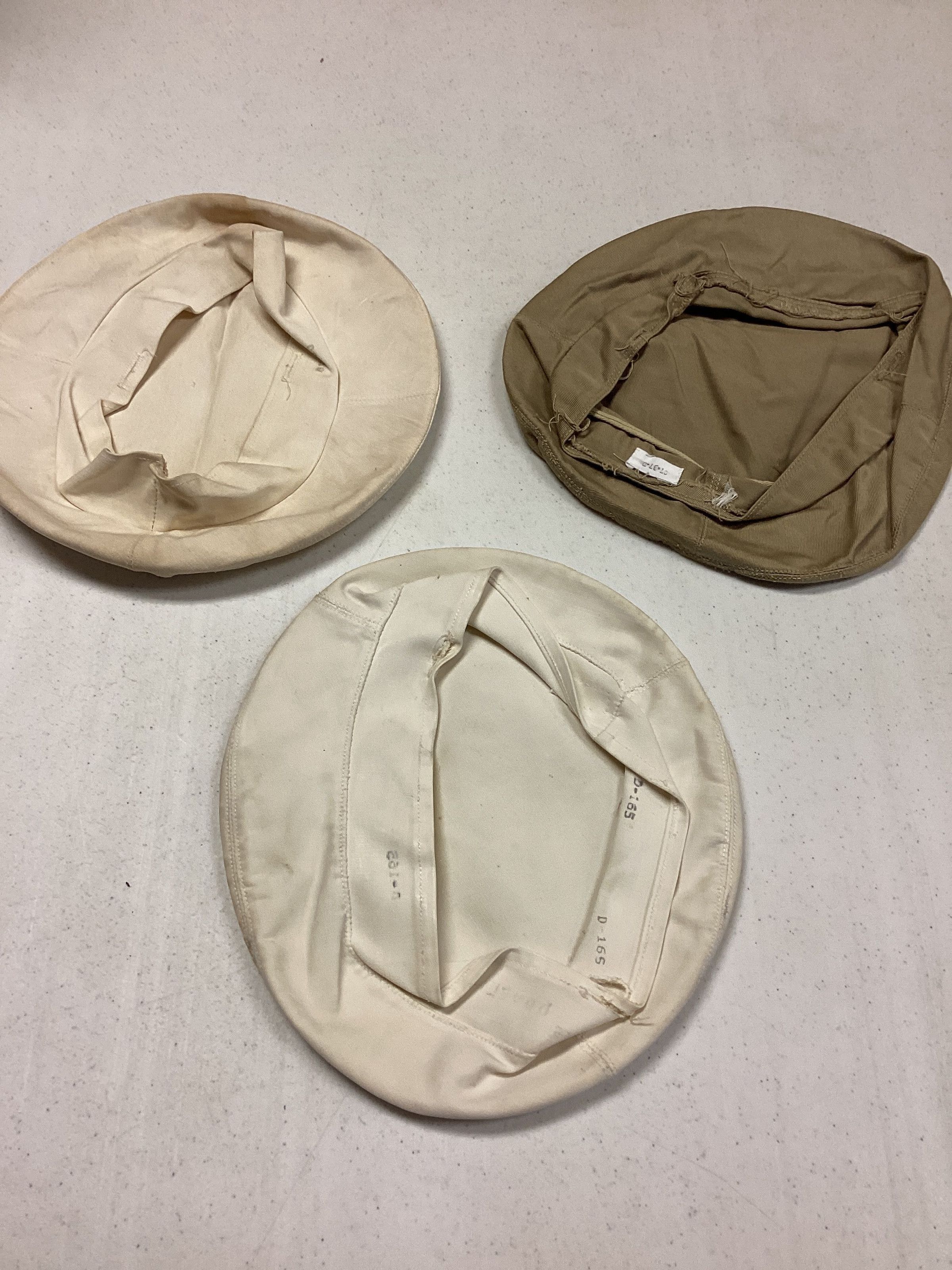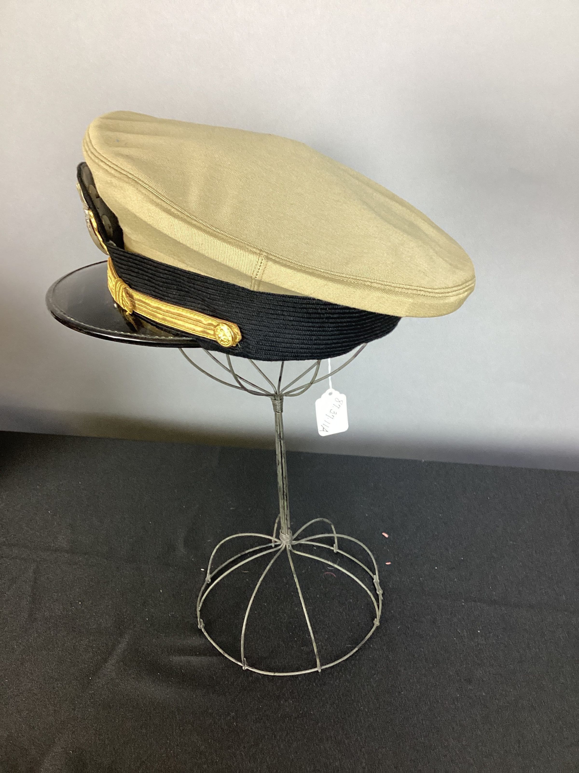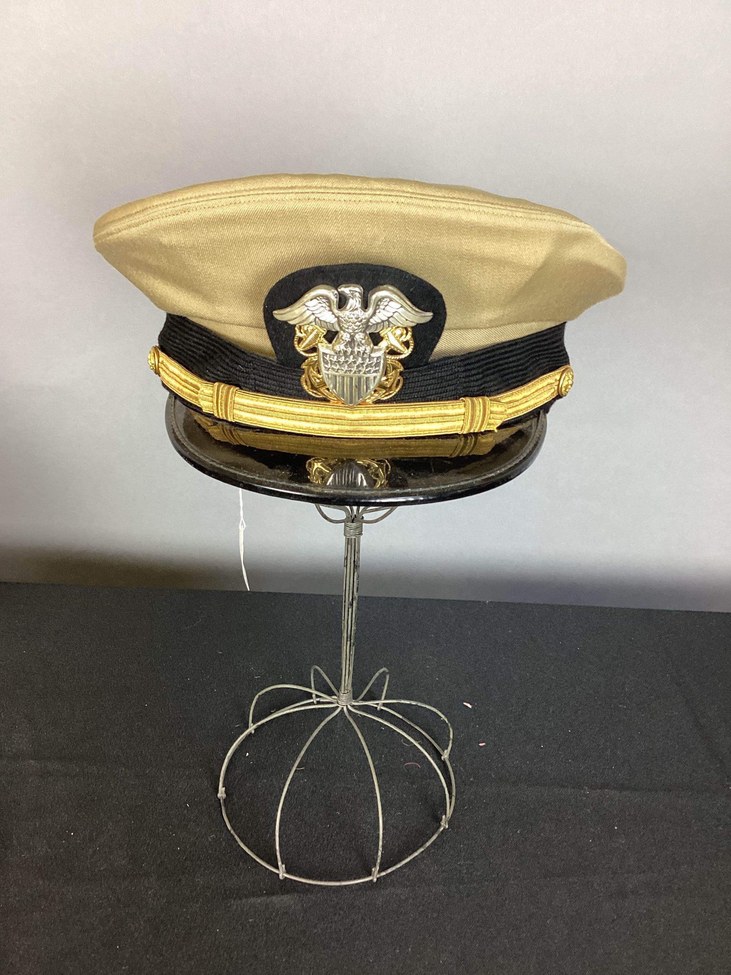 Navy officer's cap, khaki-color top, black plastic brim, around cap is a 1.5" black corded band with a 1" gold band around front held at each end with a button, Navy insignia in silver and gold on block in front. Leather sweat band around inside. Inside cap is signboard-like logo that reads "Berkshire/Caps". 9 cap tops as seen in photos. There are all labeled 87.37.DUse