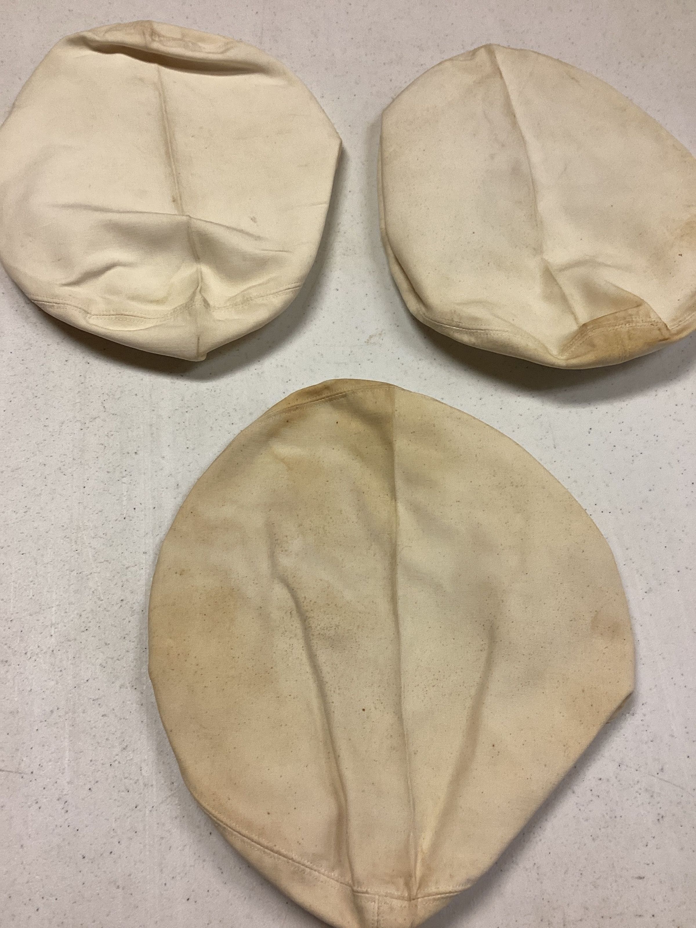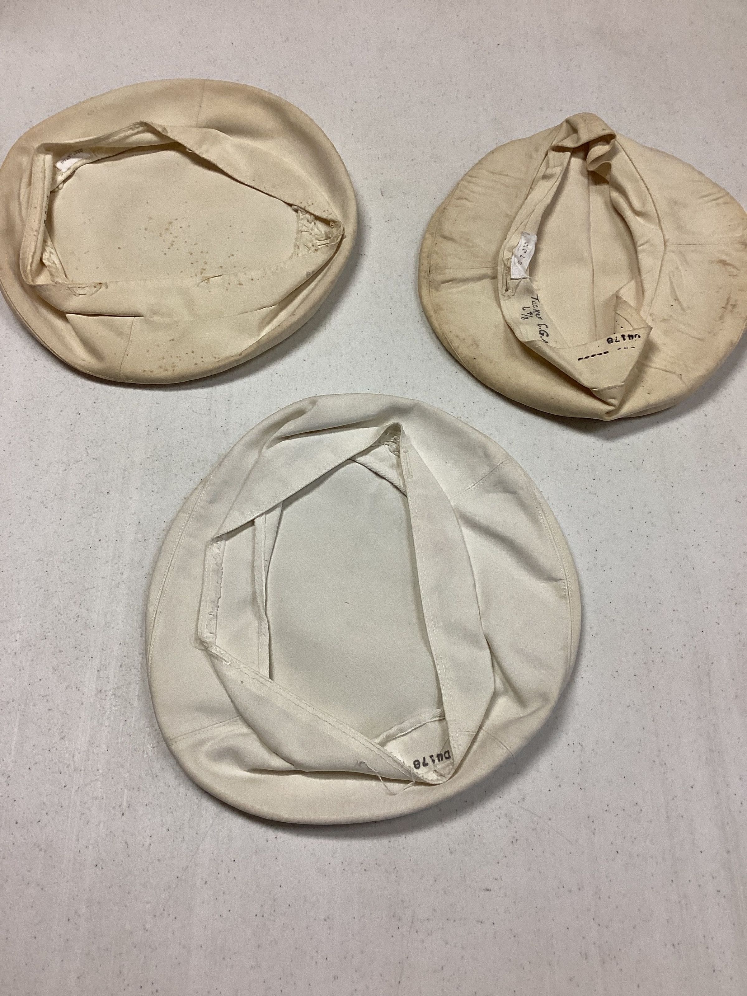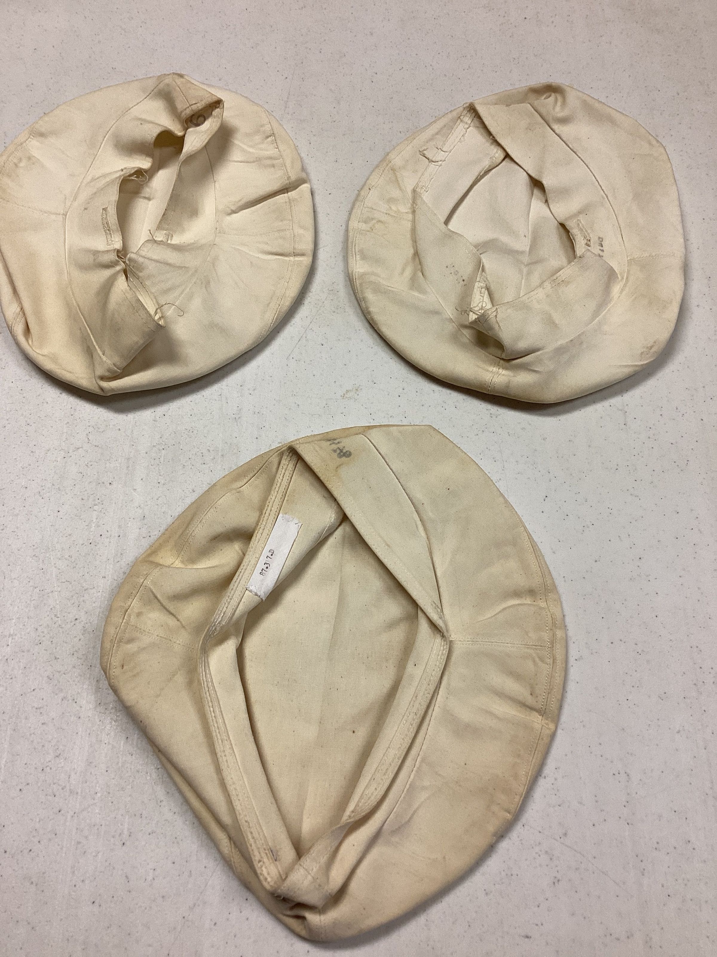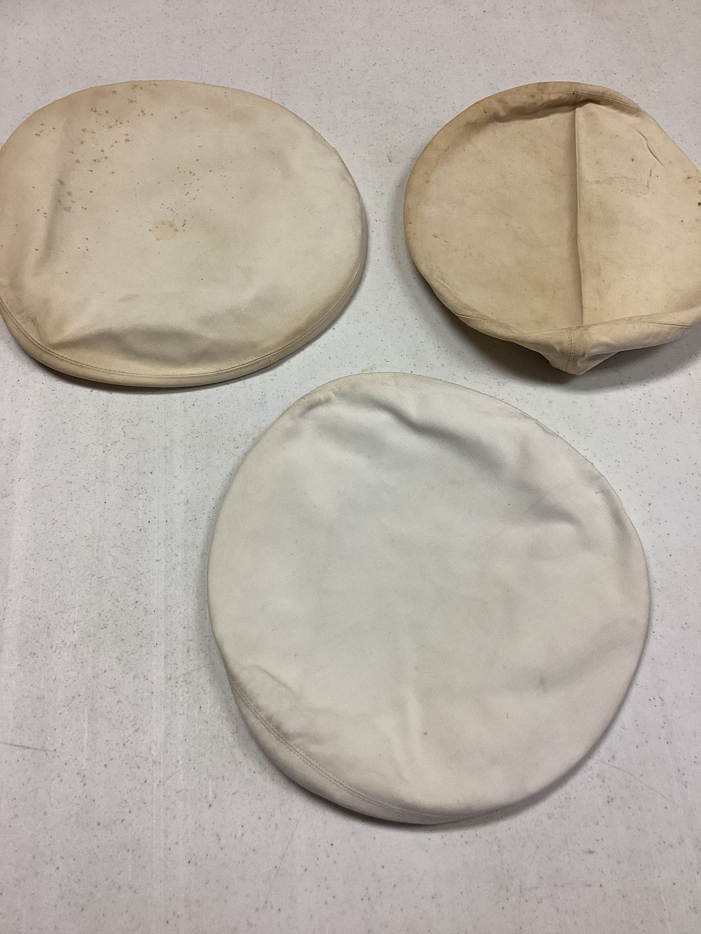 Navy officer's cap, khaki-color top, black plastic brim, around cap is a 1.5" black corded band with a 1" gold band around front held at each end with a button, Navy insignia in silver and gold on block in front. Leather sweat band around inside. Inside cap is signboard-like logo that reads "Berkshire/Caps". 9 cap tops as seen in photos. There are all labeled 87.37.DUse