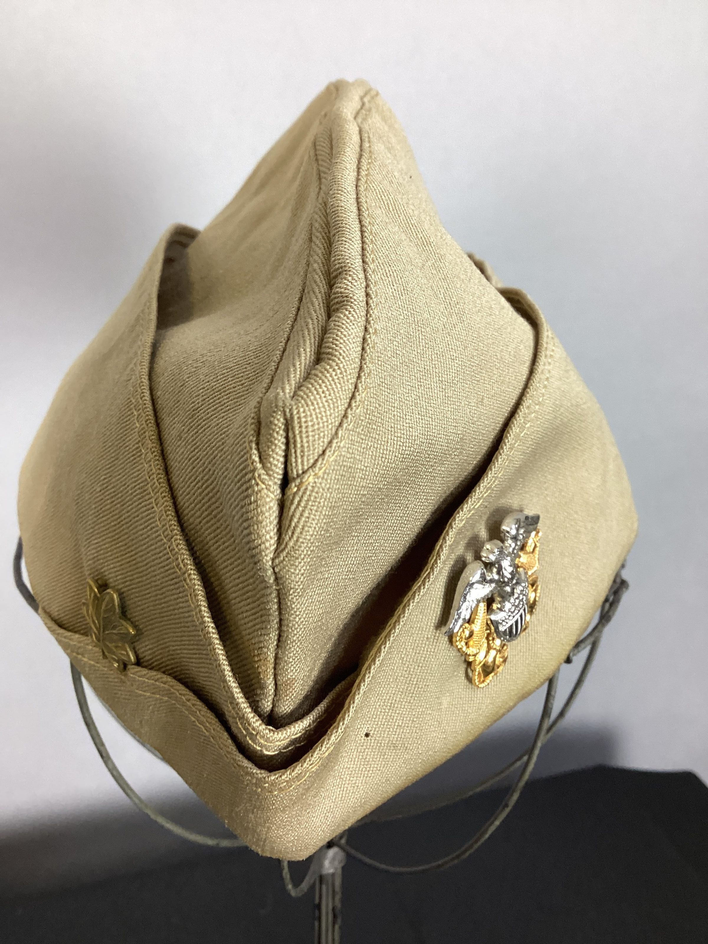A khaki colored folding hat with curved top, a rounded cuff around it, cuff 3" on top edge. Insignia - gold and silver with eagle over a shield and crossed anchor, and leaf shaped pin - on right side - each fastened with 2 studs through the cloth. Leather trim sweat band inside and cloth size label. Hat lined with slik lining.Use