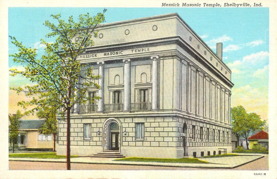 A color photographic postcard of the Messick Masonic Temple, Shelbyville, Ind. Title: Messick Masonic Temple, Shelbyville, Ind is at the top of the photographic postcard. In the lower right corner there is a code which reads: 5A42-N