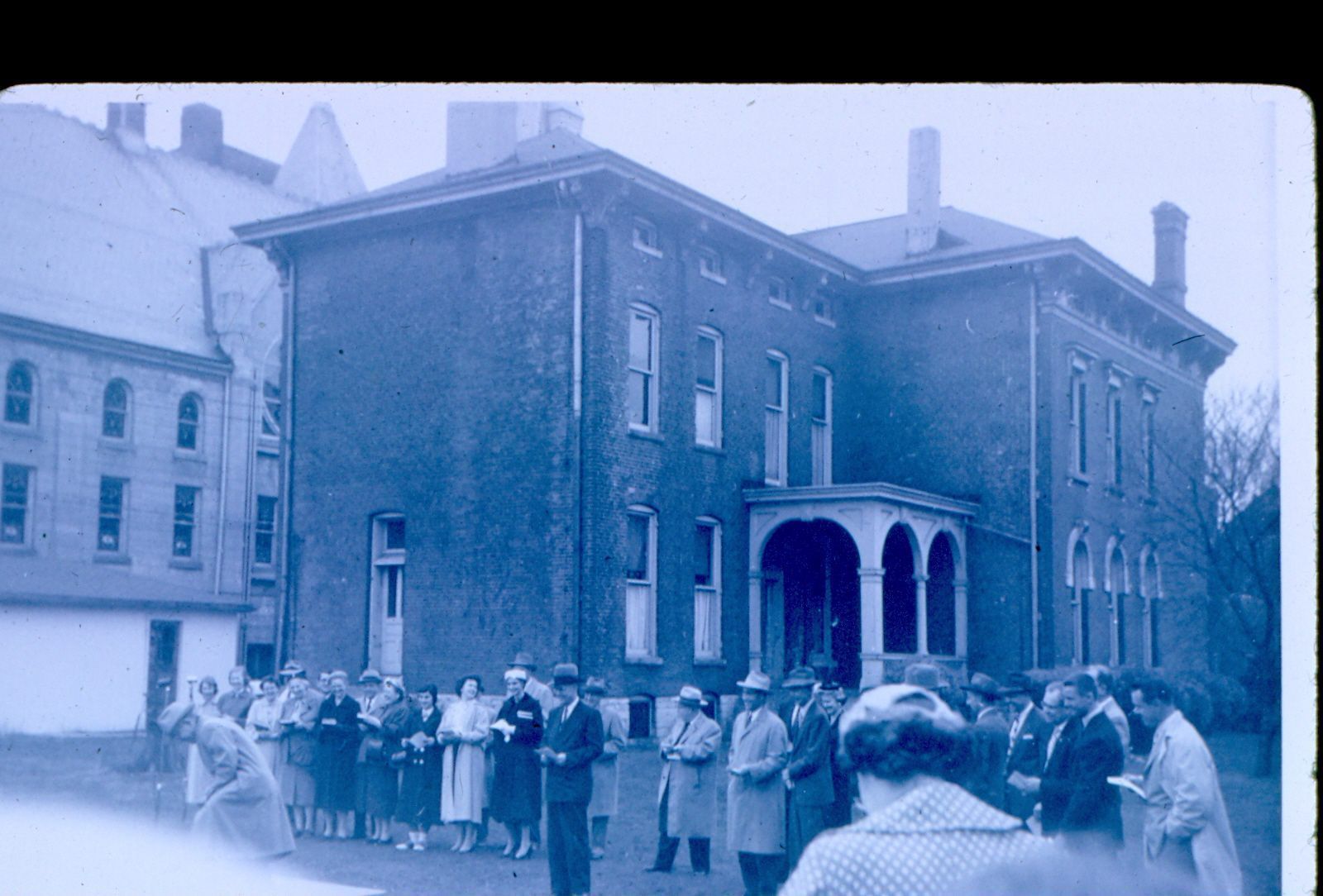 Black and white photographic slide in landscape format. Slide frame is marked: "Breaking Ground for Methodist/Education Bldg."Collection