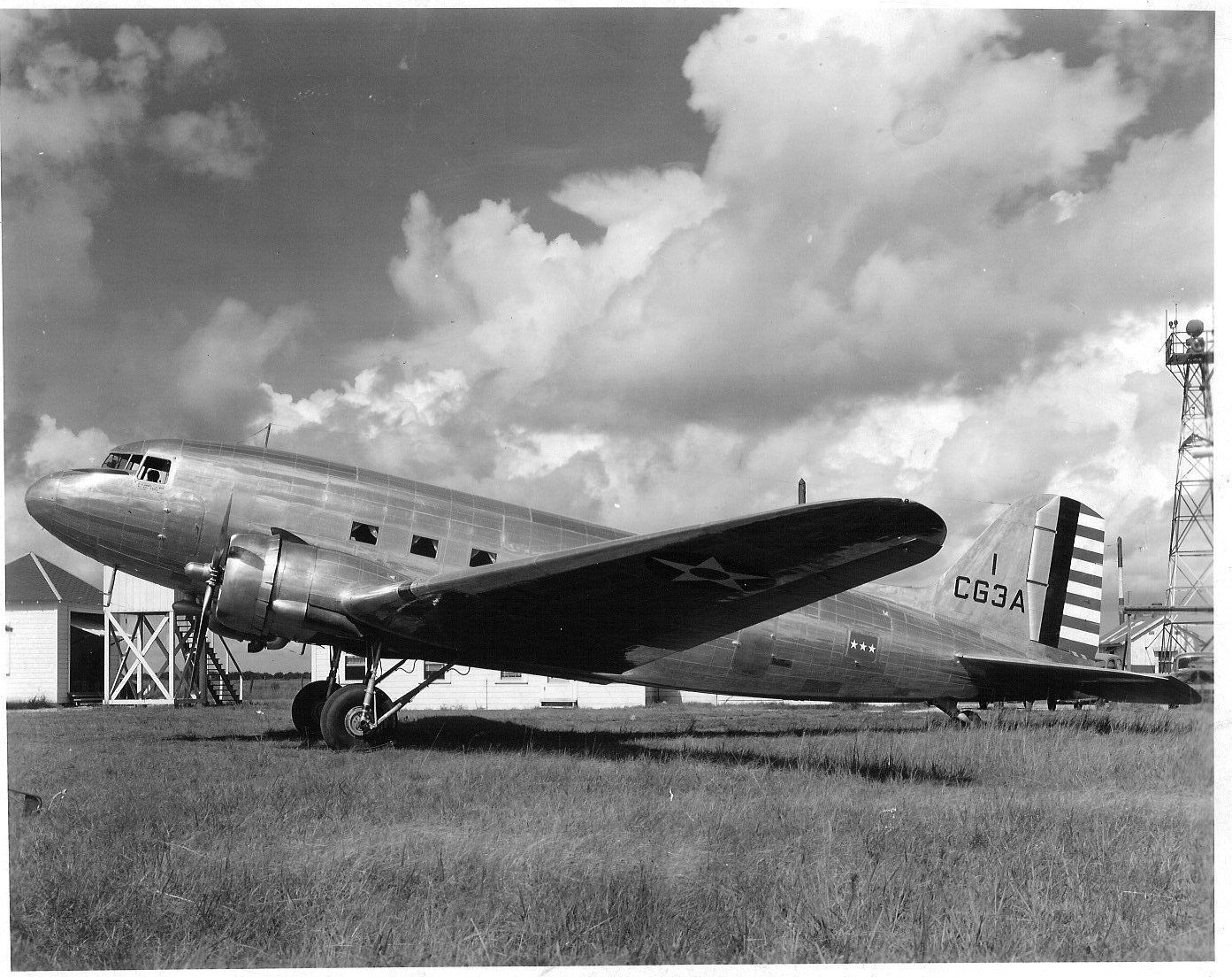 Black and white glossy photographic print; side view of an airplane; underside of wing has the Star within a circle of the Army Air Corp; rudder has dark vertical bar and series of dark & light horizontal stripes; tail is marked "I/CG3A"; passenger door located below & behind cockpit windows and another one located about half-way between wings & tail; between 2nd door & tail is a small hatch w/3 stars on it; 3 curtained windows visible above wing; plane has a bright reflective skin and is parked on grass; parts of buildings in background.
