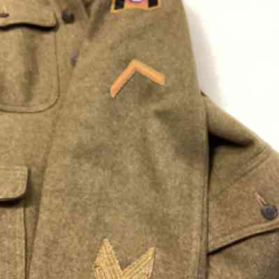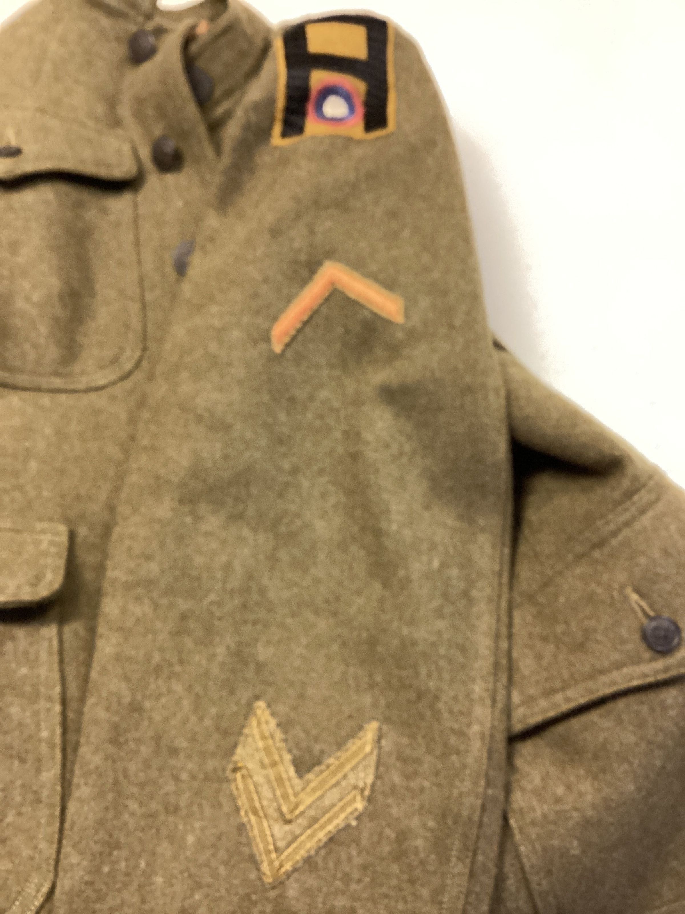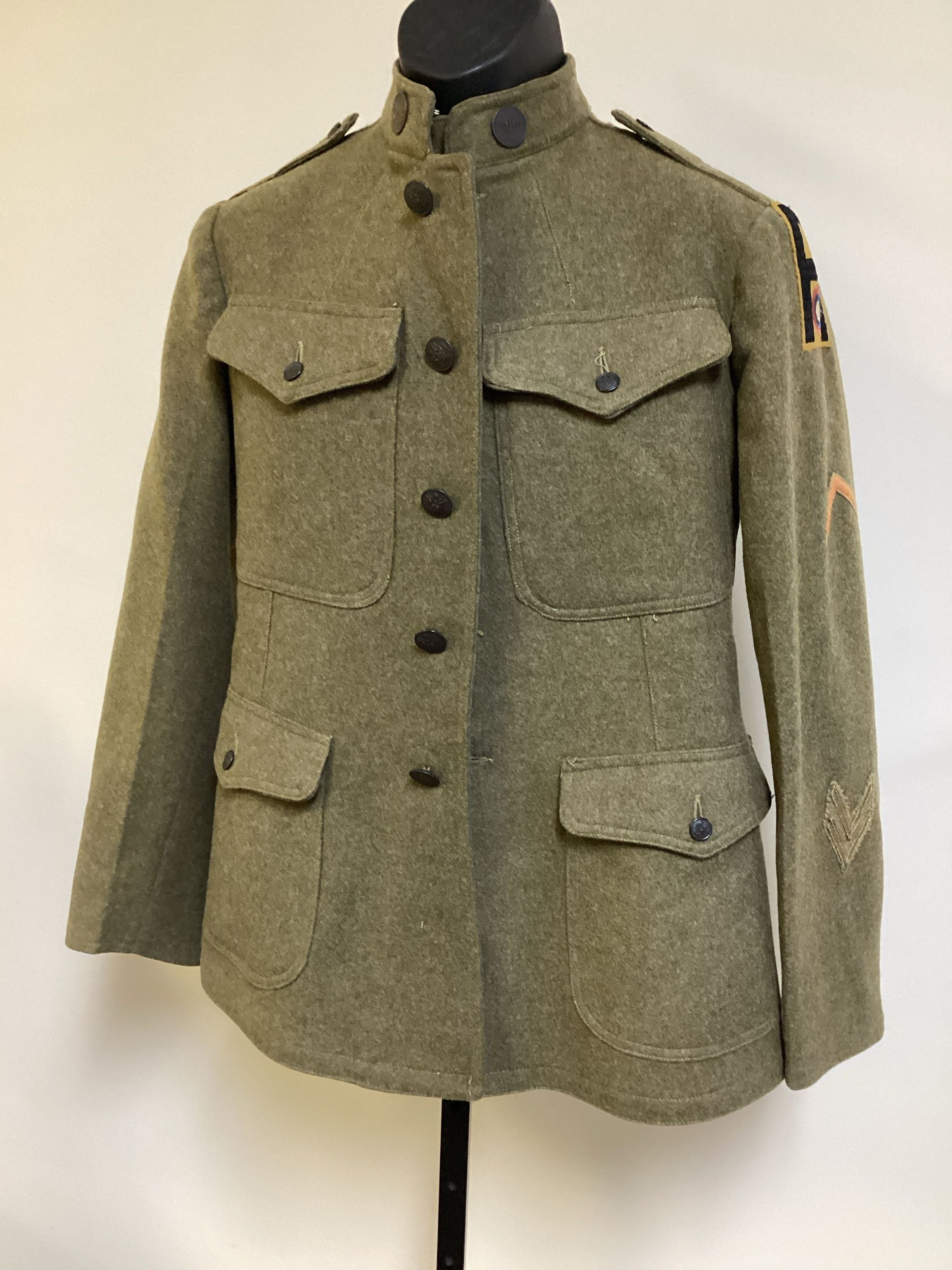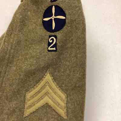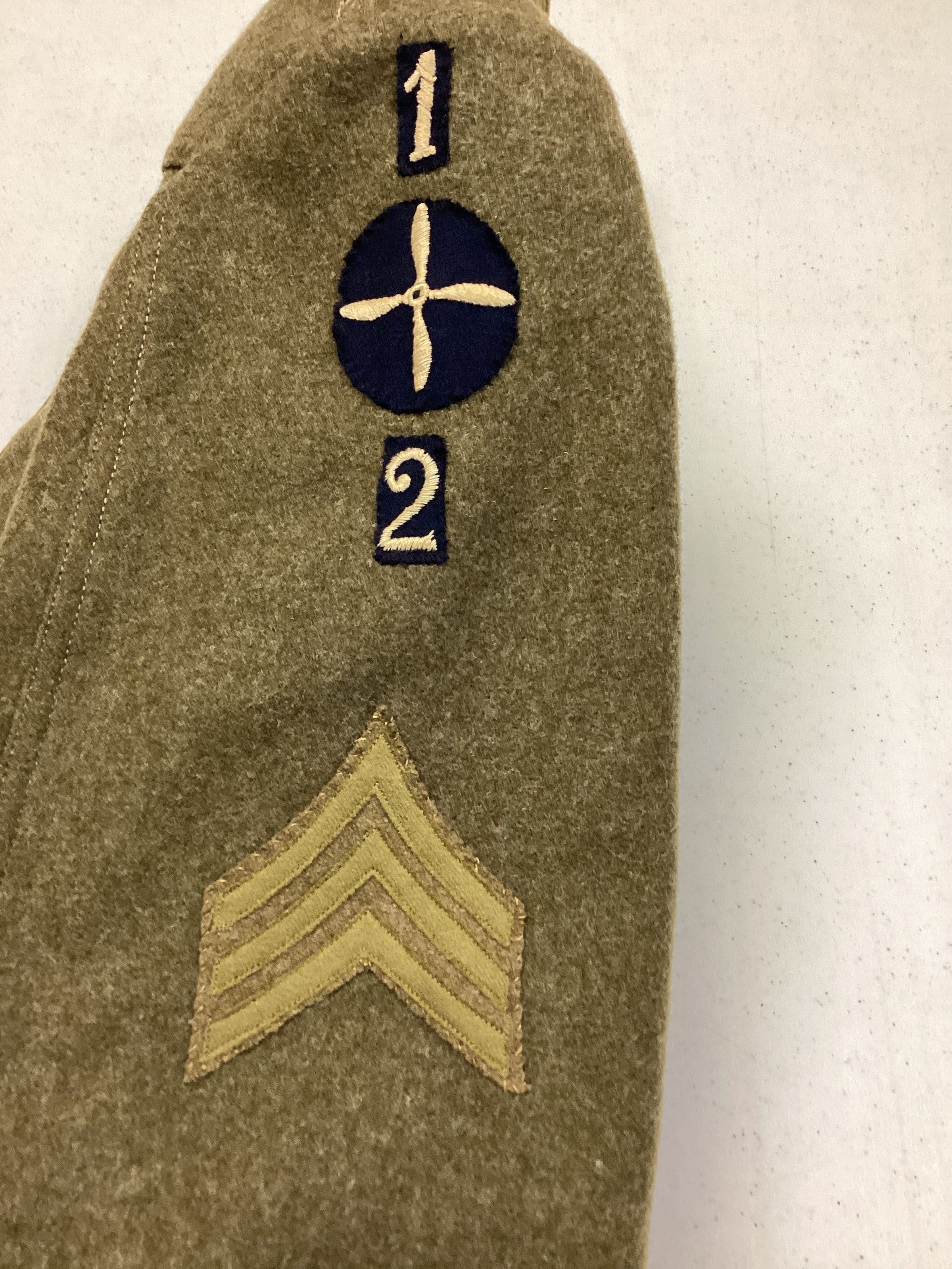 Olive drab wool tunic, WWI army with 5 eagle buttons down front, 1 each on breast pocket and lower pocket flaps. On right stand up collar there is a pin inscribed U.S. and on left is a pin inscribed with propeller and wings, signifying air service. Left shoulder has patch signifying Army Air Service. Patch below this is an upside down V, showing soldier has been honorably discharged from the American Expeditionary Forces during or after WWI. On lower left sleeve is a chevron of corporal. On right shoulder the patch is the insignia for the Army Air Service. Below this is a chevron denoting rank of sergeant.Collection