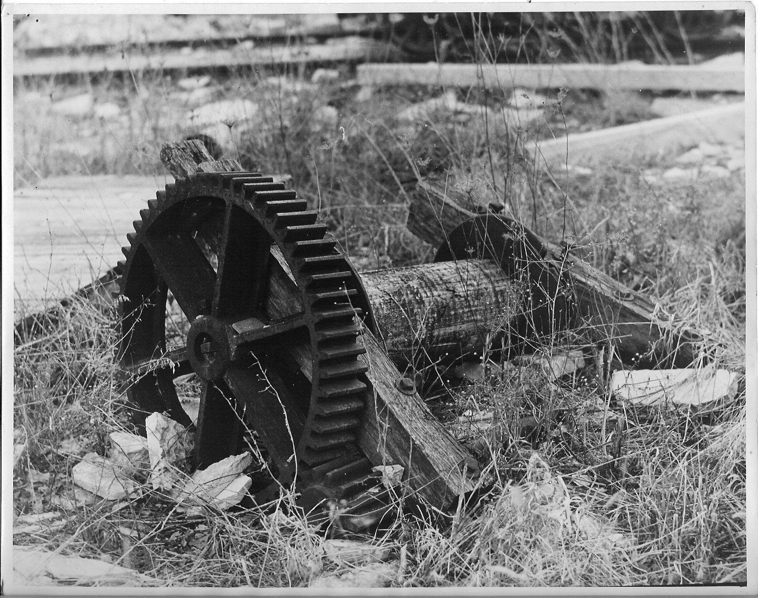AB: 2 identical black and white photographic prints; depicts large gear attached to heavy beam, beyond that is round wood drive shaft and then another heavy beam; apparatus laying among weed and rocks; part of another gear buried in ground in contact with bigger gear. Appears to be drive appartatus from water-powered mill. Donors found at Moris Van Way's estate sale and purchased for museum collection. Donation, 12/1988.Collection