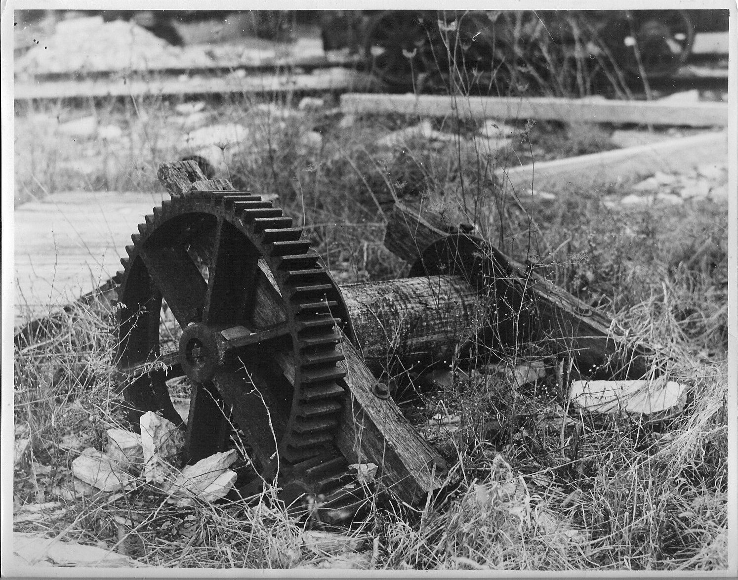 AB: 2 identical black and white photographic prints; depicts large gear attached to heavy beam, beyond that is round wood drive shaft and then another heavy beam; apparatus laying among weed and rocks; part of another gear buried in ground in contact with bigger gear. Appears to be drive appartatus from water-powered mill. Donors found at Moris Van Way's estate sale and purchased for museum collection. Donation, 12/1988.Collection