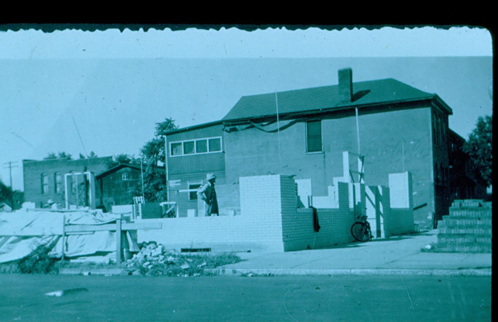 Donation, 07/26/2005. Black and white photographic slide in landscape format. Marked: "Building of/Miller & Kelly (sic)/milk plant/E. Washington St/Sept. 1945."Collection