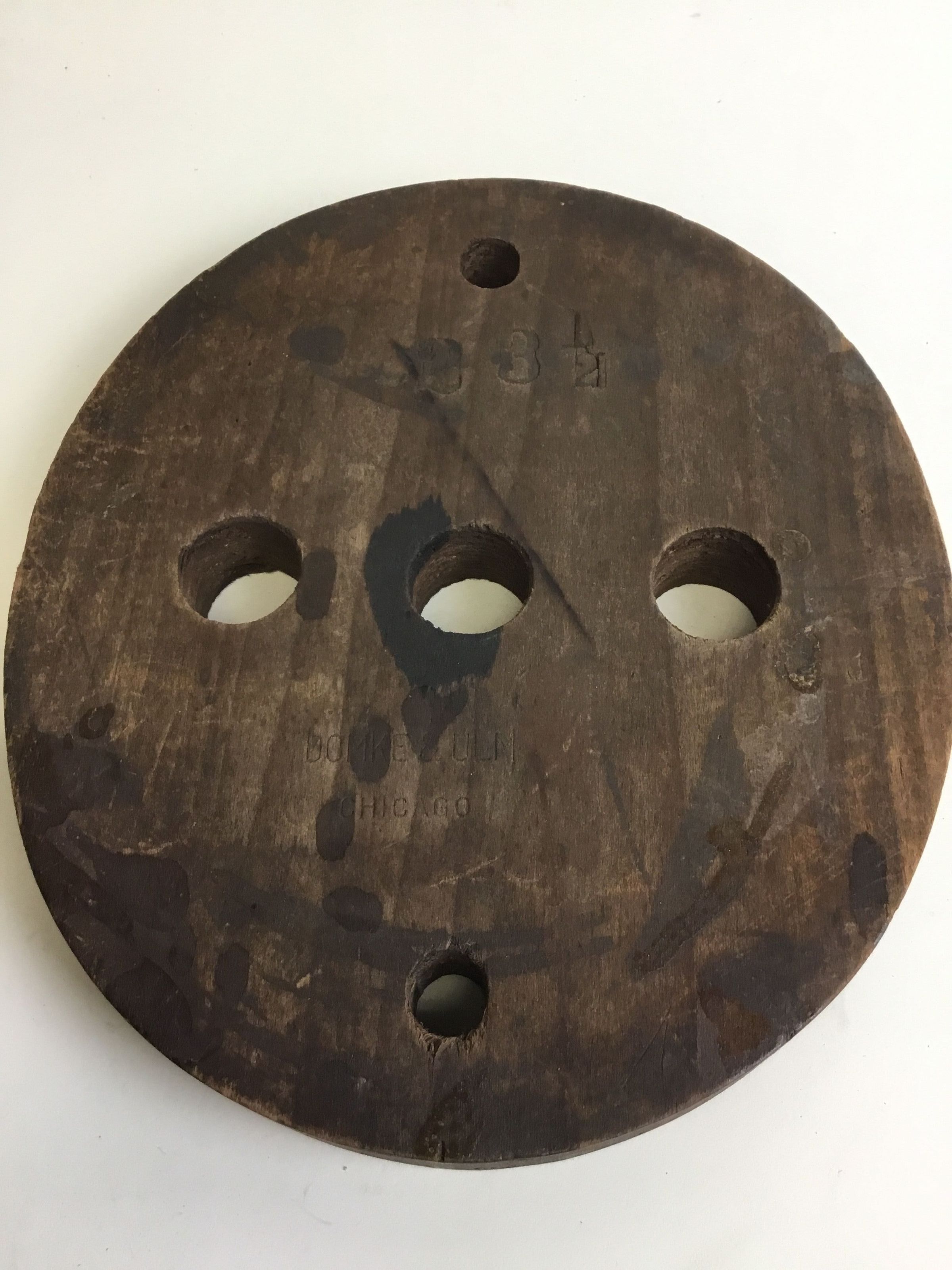 Wood, has five holes the three in the center are all measure 7/8" and run in a roll, tow small ones measure 1/2" across. More egg shapred than round; measure 8" at widest and 7" at narrowest.